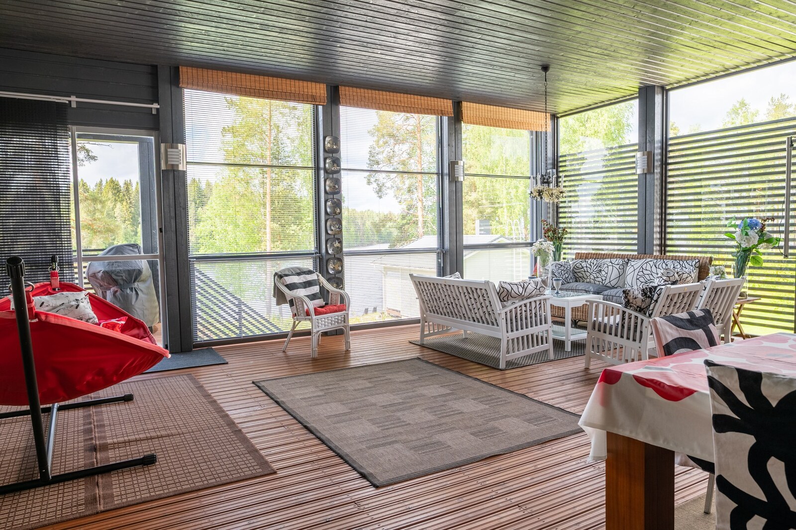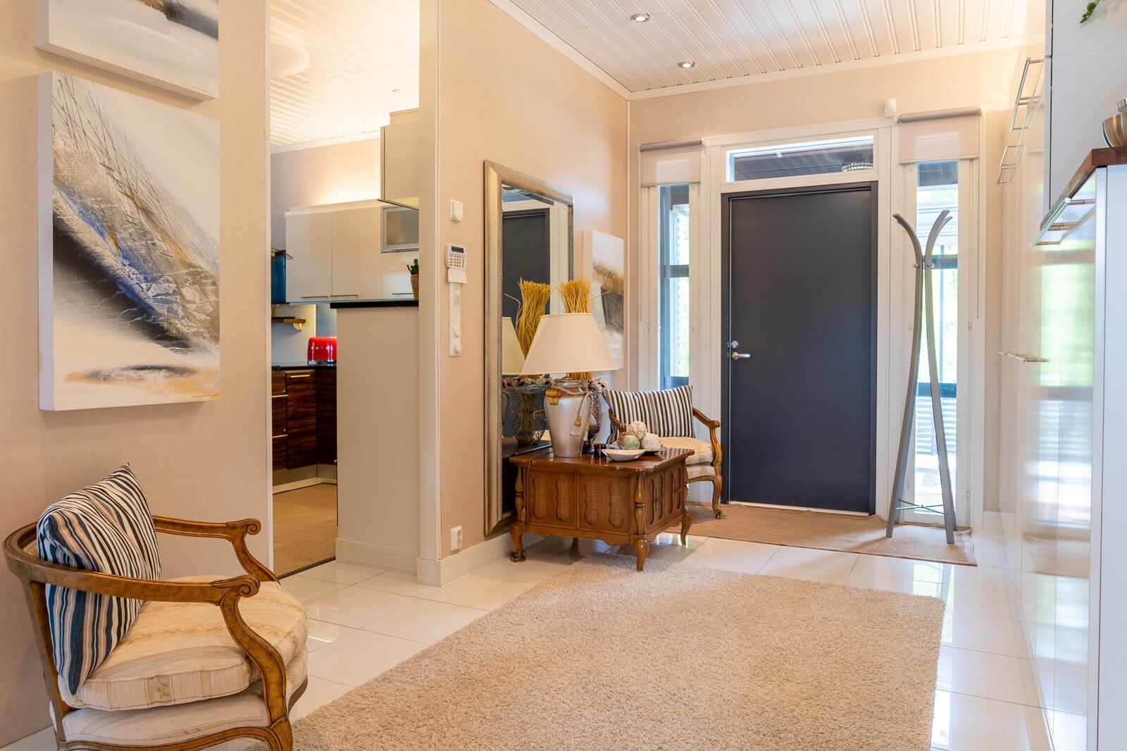 Tässä kodissa on kaikki, mitä tarvitset. Sisääntulokerroksessa on avaraa keittiö-olohuonetilaa sekä hulppea n. 50 m2 lasitettu terassi ja kaksi makuuhuonetta. Levolliset järvimaisemat rauhoittavat mieltä vuodenajasta toiseen. Lasitettu terassi luo puitteet isommallekin vierasväelle vaikka juhlia varten tai rentoon oleskeluun perheen kesken.