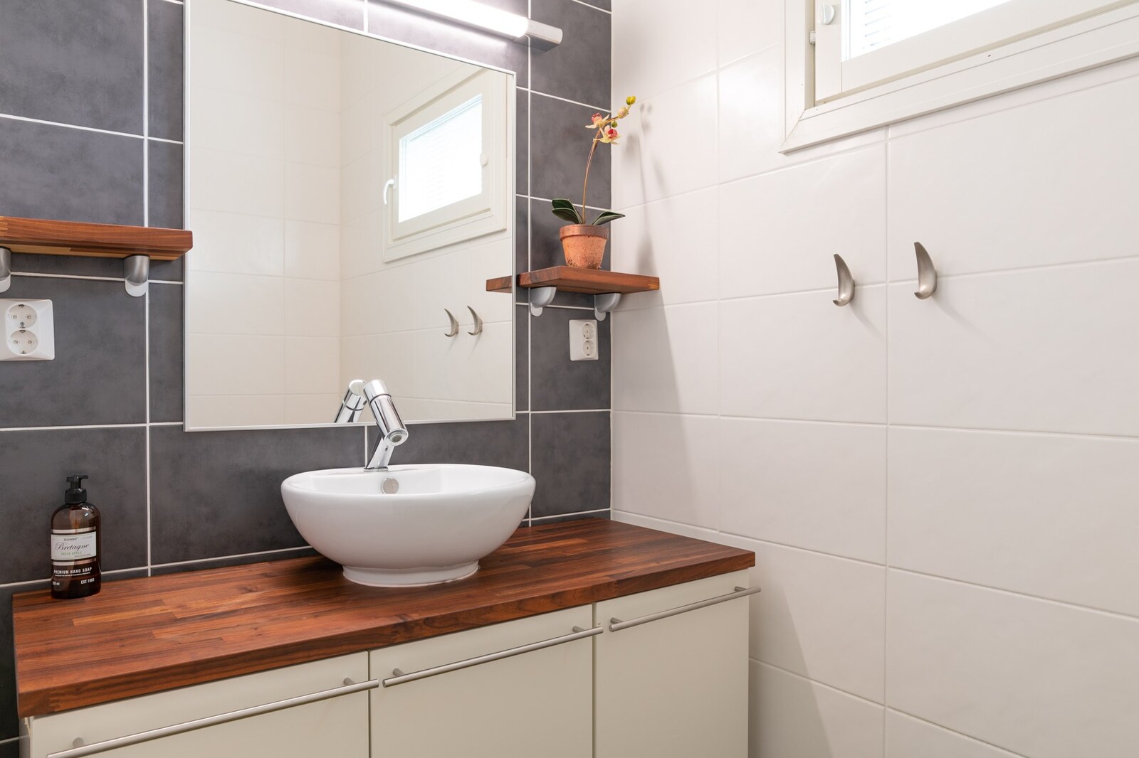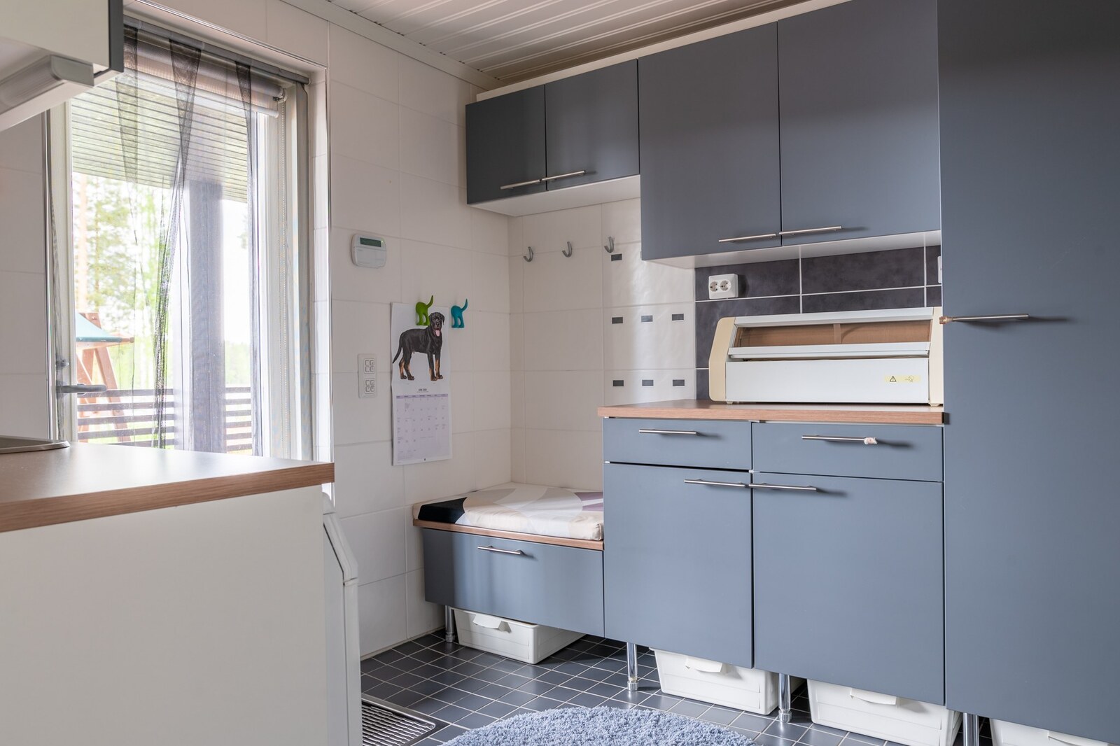 | Kodinhoitohuoneen kuvaus | Lattialämmitys, pyykkikaapit, pesukoneliitäntä ja pöytätaso, lattiat (laatta), seinät (maali ja kaakeli) |