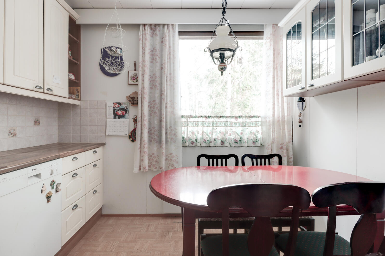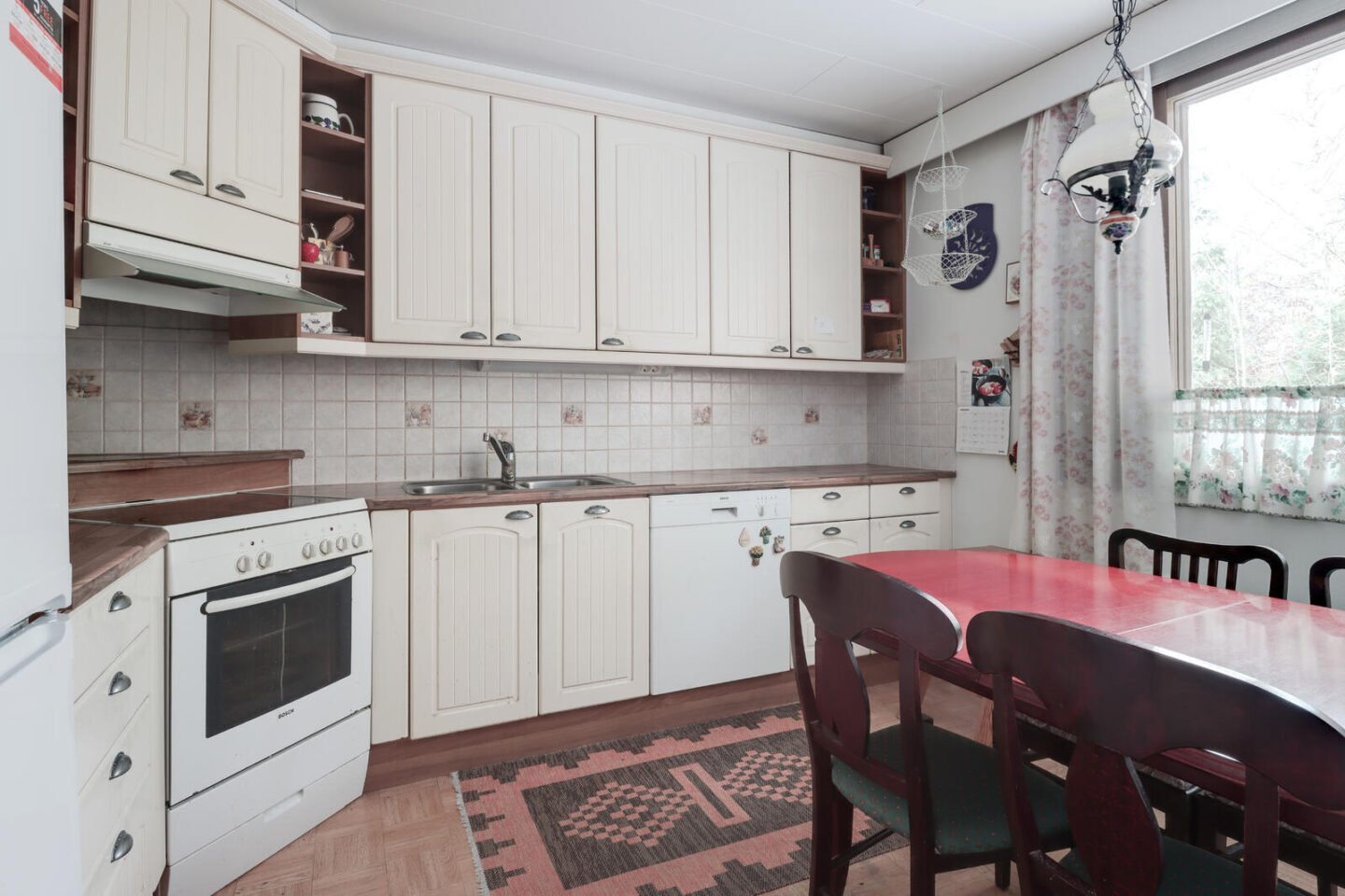 | Keittiön kuvaus | Liesi (Keraaminen liesi), työtasot (laminaatti), seinät (maali), lattiat (muovimatto), jääkaappipakastin (2023), liesituuletin, astianpesukone ja kiinteät valaisimet |