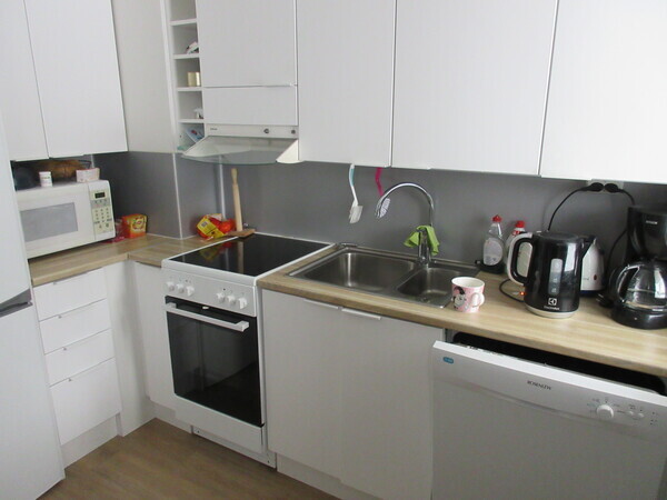 Liesi (Keraaminen liesi), työtasot (laminaatti), seinät (maali), lattiat (vinyyli), astianpesukone, jääkaappipakastin ja liesituuletin |