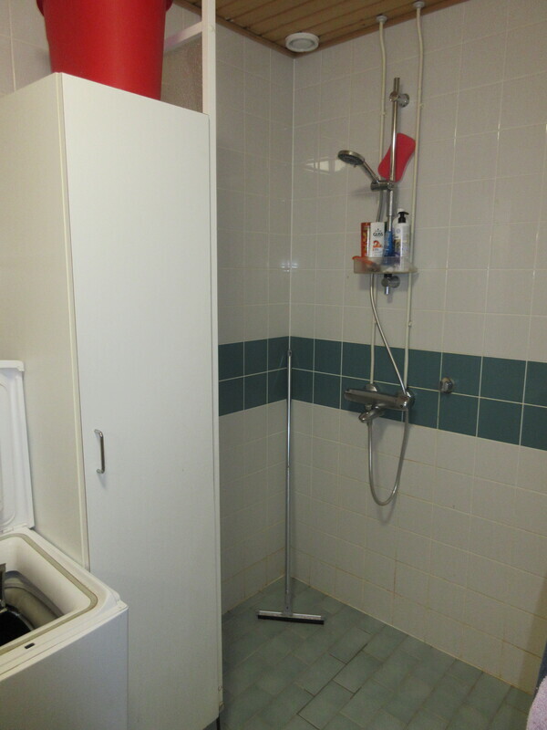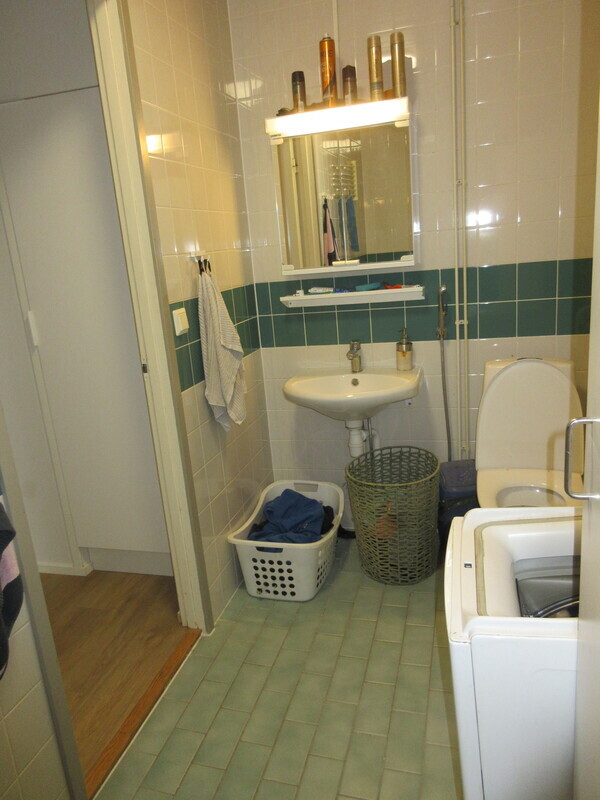 Suihkuseinä, pesukoneliitäntä, wc-istuin, peilikaappi, suihku, allaskaappi ja kiinteät valaisimet, seinät (kaakeli), lattiat (laatta) |