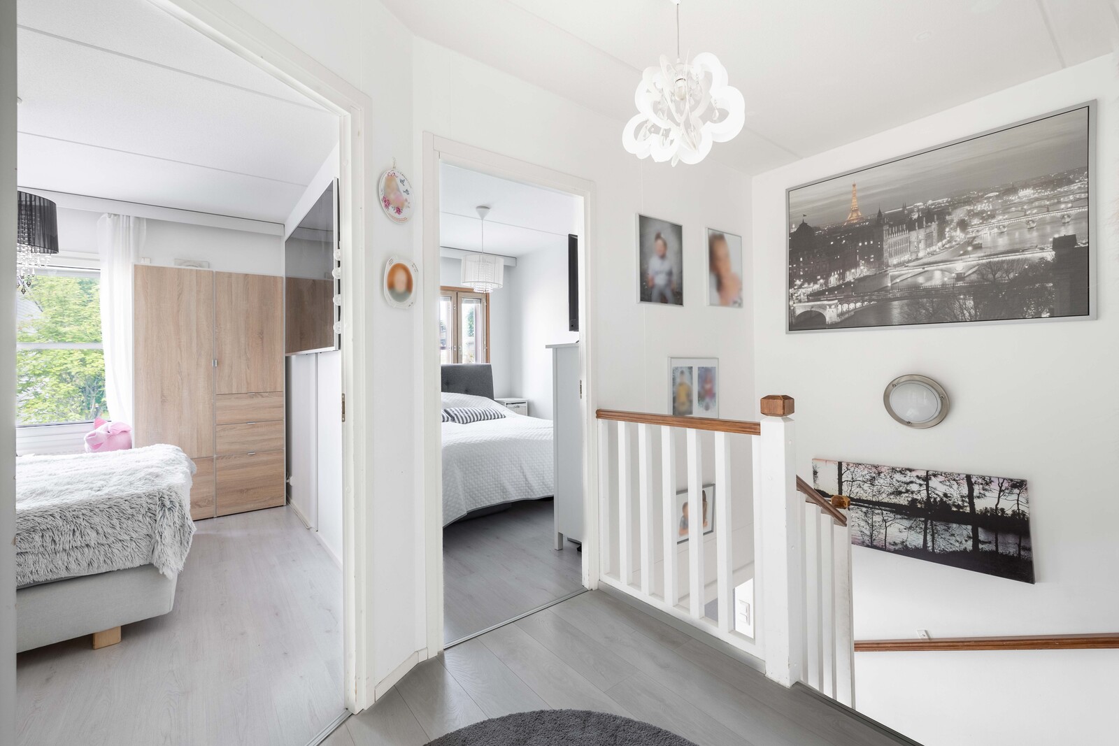 Yläkerrassa sijaitsevat kolme tilavaa makuuhuonetta, noin kymmenen vuotta sitten uusittu kylpyhuone sekä oma sauna – täydellinen paikka rauhoittua arjen kiireiden keskellä.