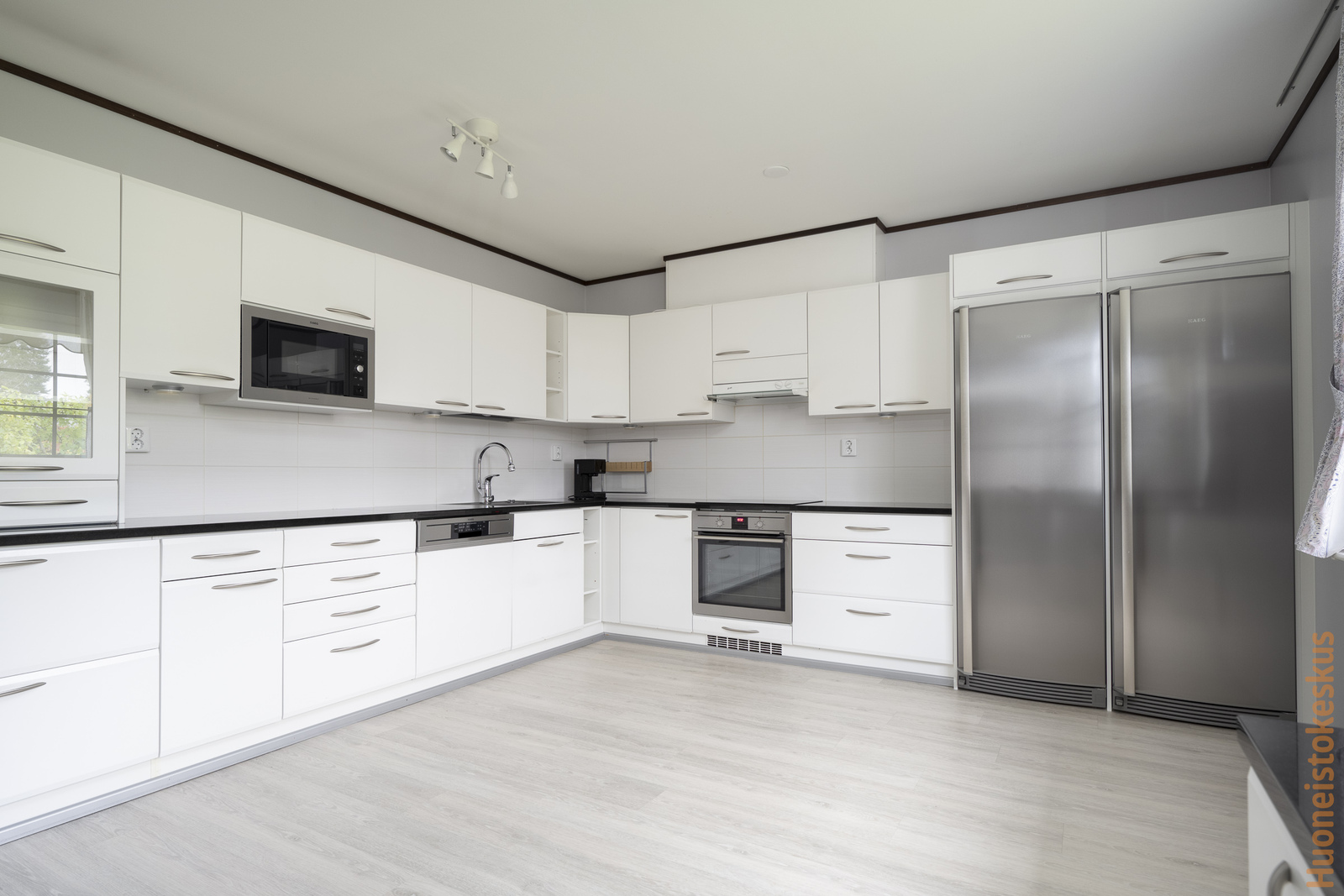 | Keittiön kuvaus | Liesi (Induktioliesi), työtasot (kivi), seinät (tapetti), lattiat (vinyyli), erillisuuni, mikroaaltouuni, liesituuletin, erillinen pakastin, astianpesukone, jääkaappi ja kiinteät valaisimet |