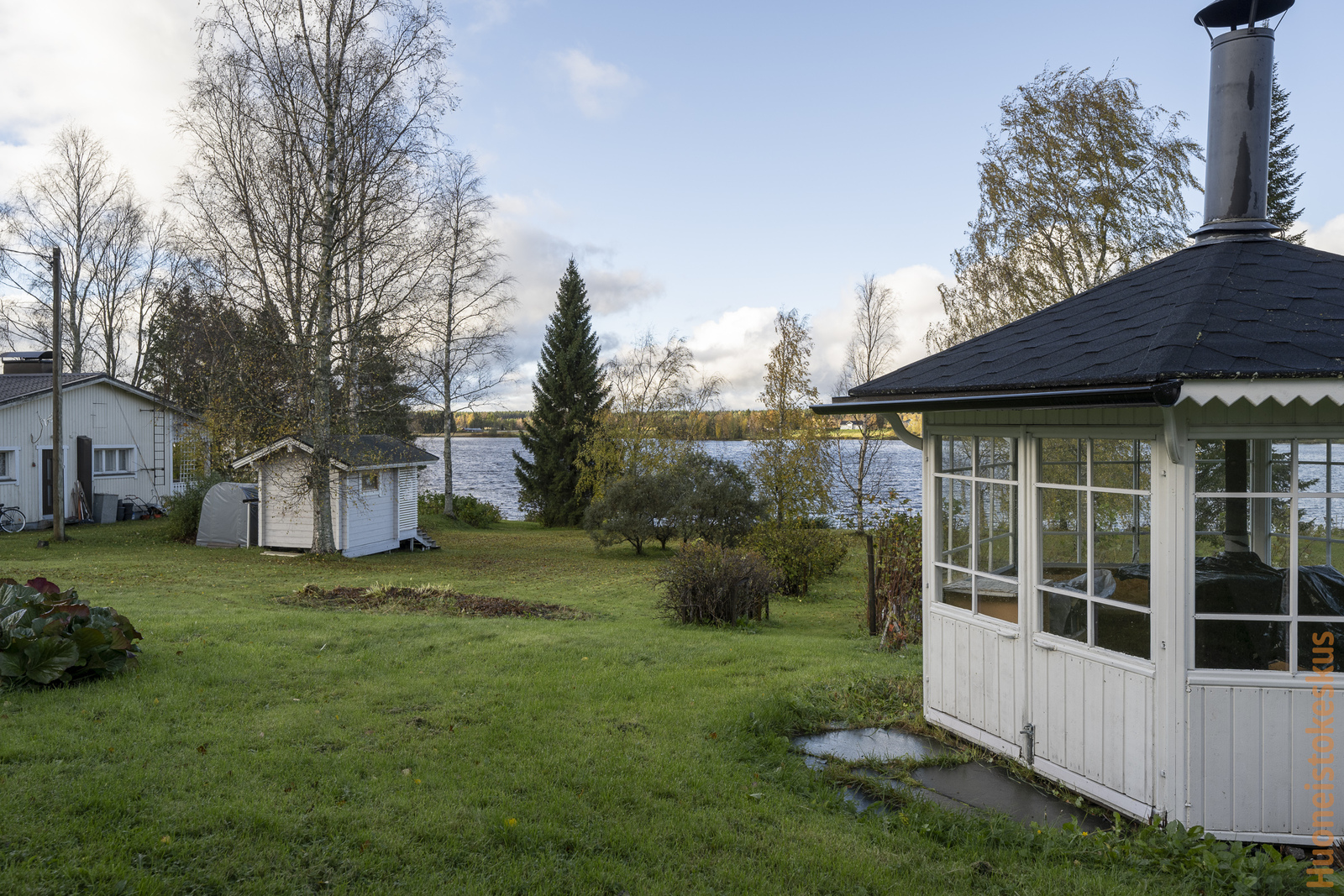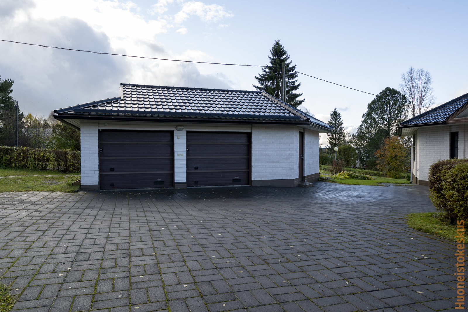 Pihan sisääntuloalue on laatoitettu. Etupihalla on nosto-ovin varusteltu autotallirakennus, jossa on tilat kahdelle autolle ja varasto. Rinnetontti laskee alas kohti jokirantaa. Rantamaisemia on mukava ihailla katetulta takaterassilta. Puutarhamaisella tontilla on marja- ja koristepensaita, omenapuita ja tyrniä. Grillikota on viihtyisä ruuanlaitto- ja seurustelupaikka. Alempana tontilla on pihasauna.