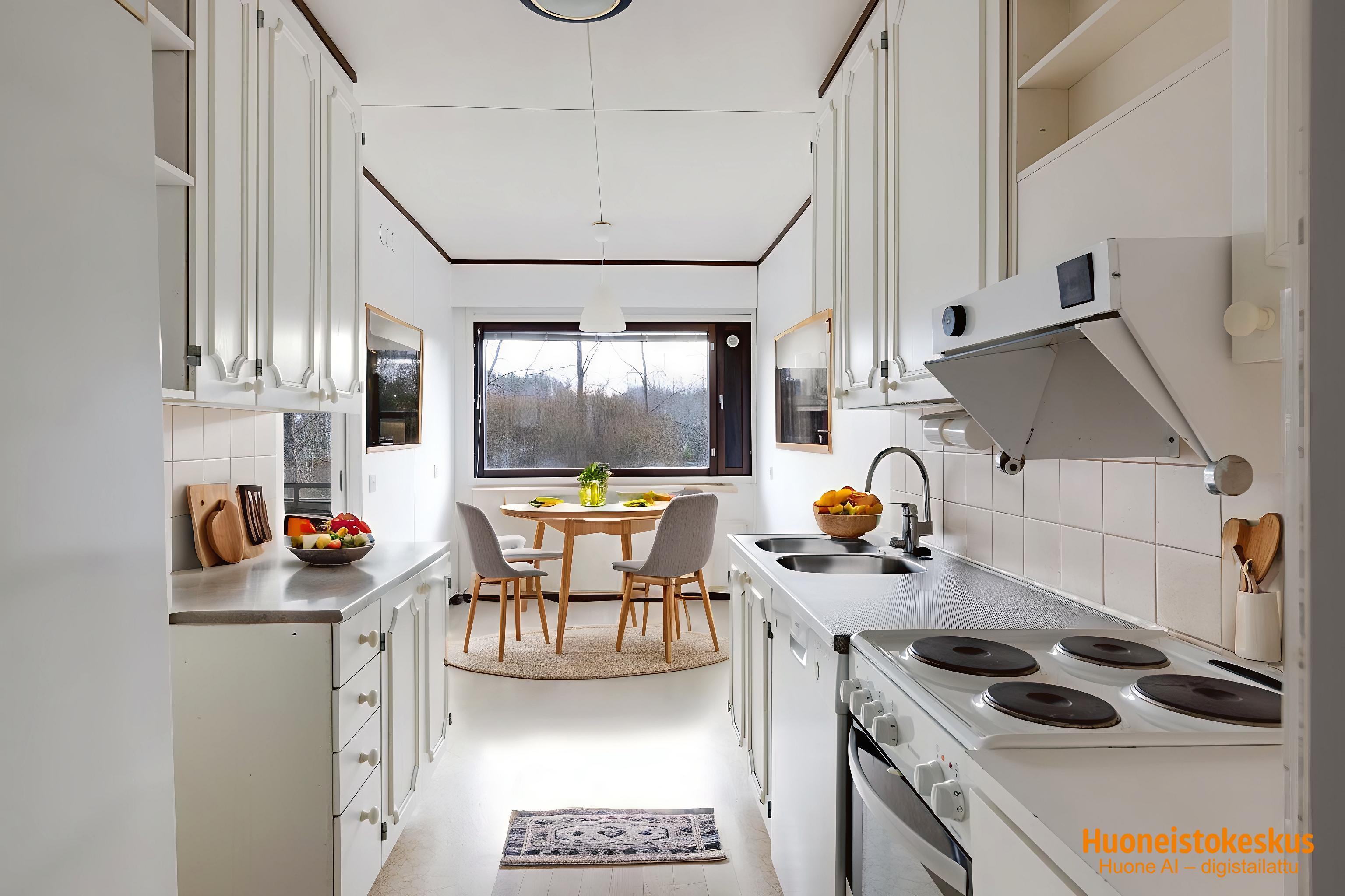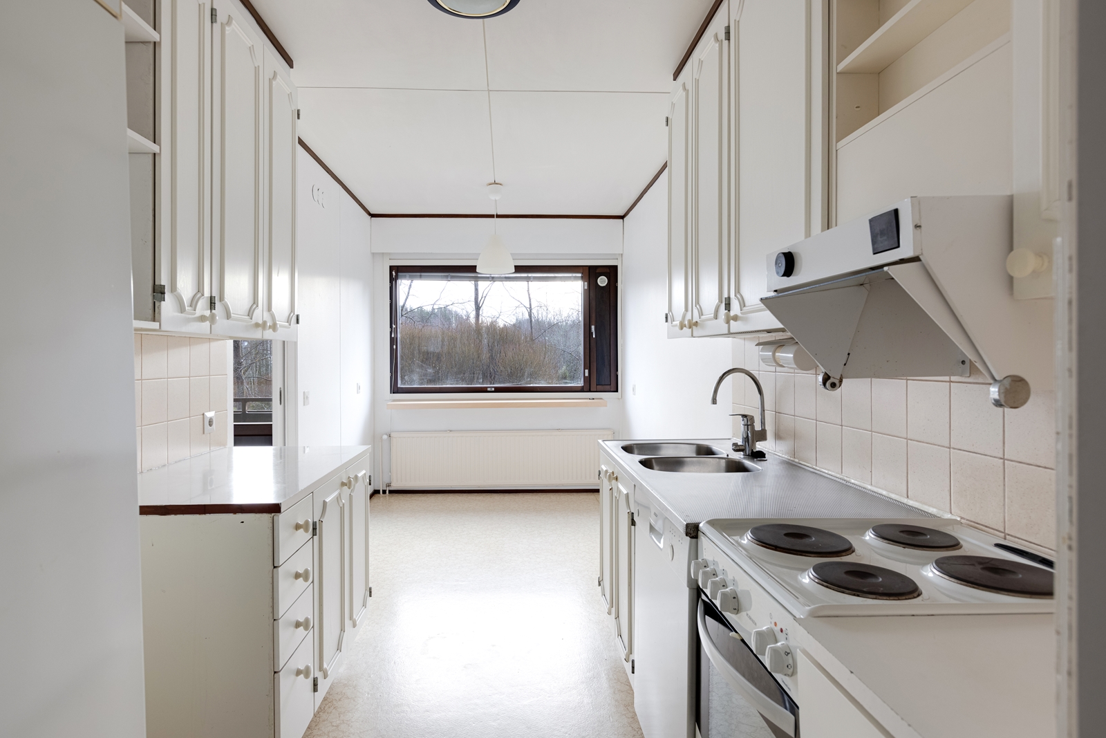 Liesi (Sähköhella), seinät (maali), lattiat (muovimatto), jääkaappi, astianpesukone ja liesituuletin |