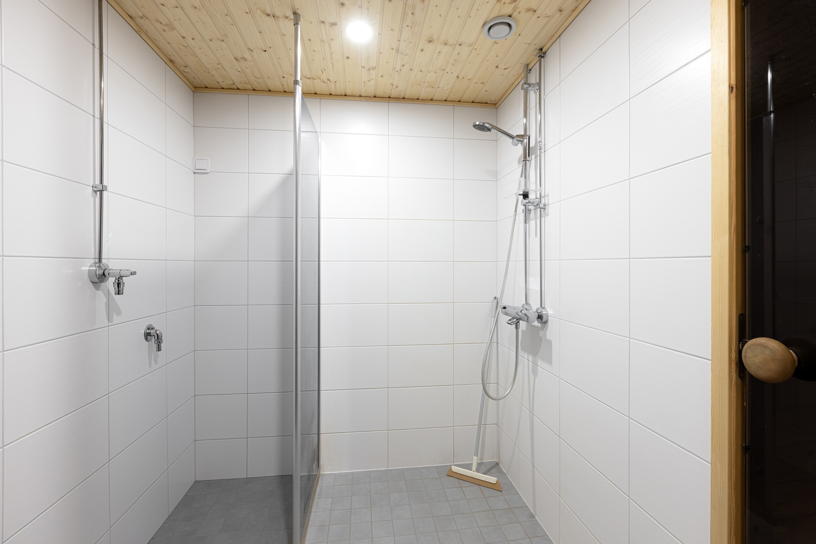 Suihku, suihkuseinä, pesukoneliitäntä ja lattialämmitys, seinät (kaakeli), lattiat (laatta) |