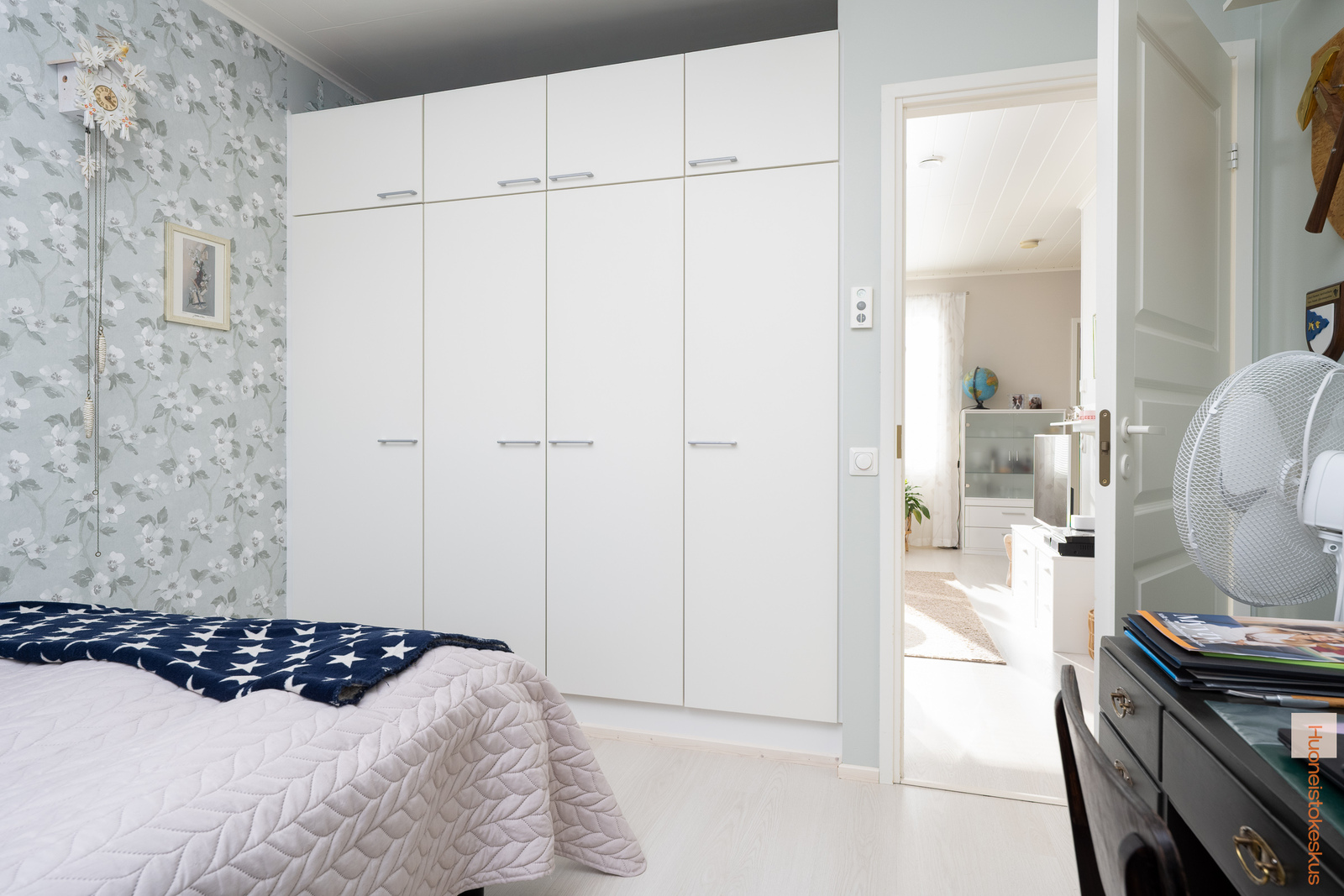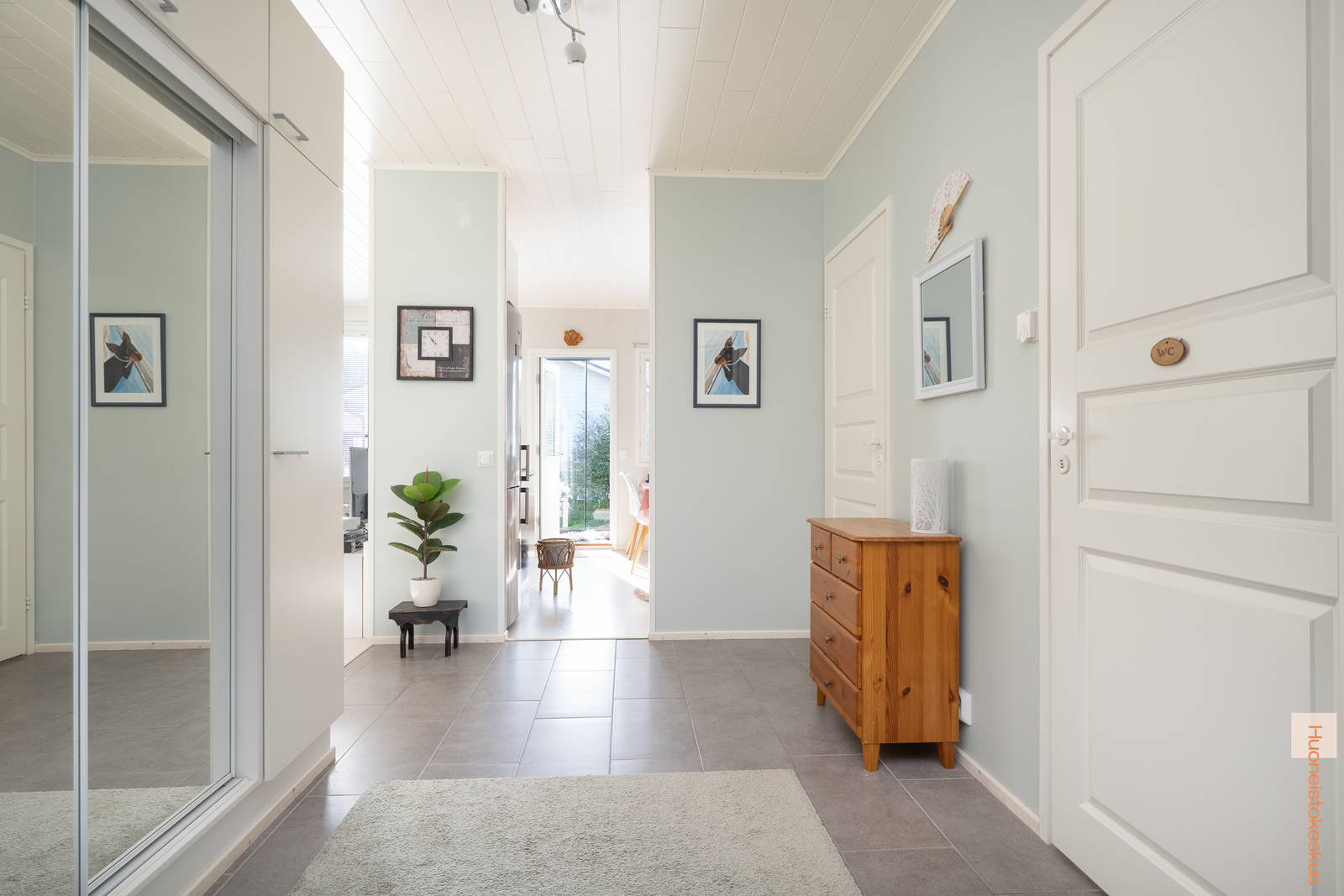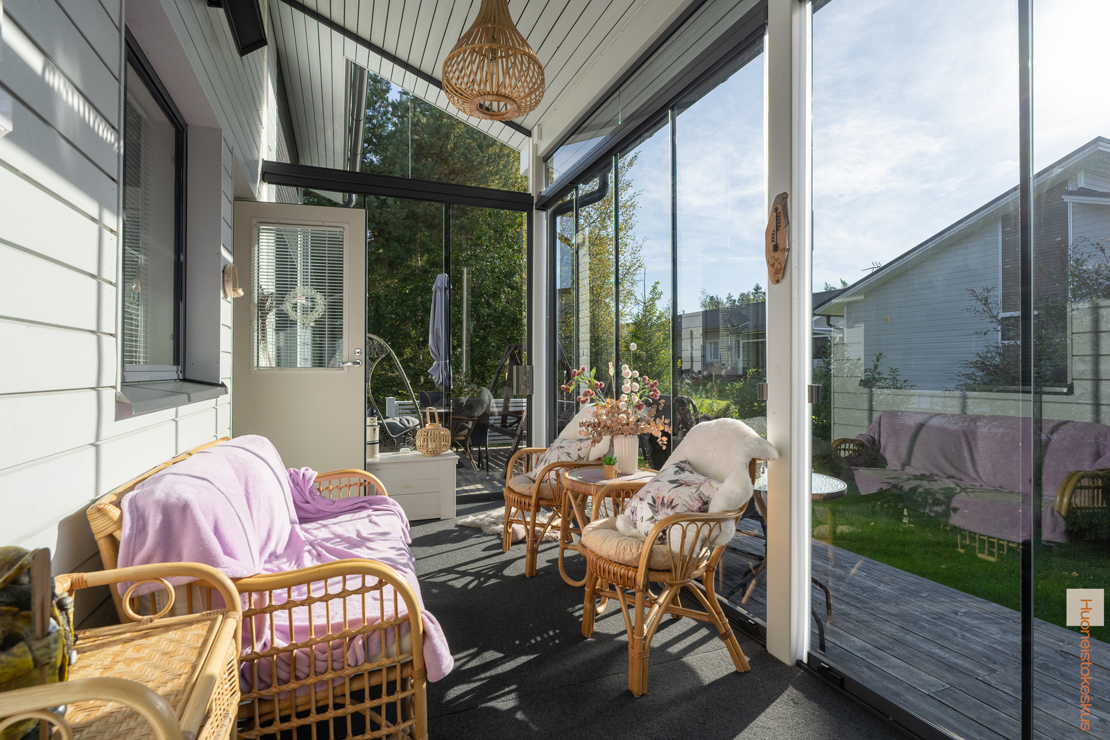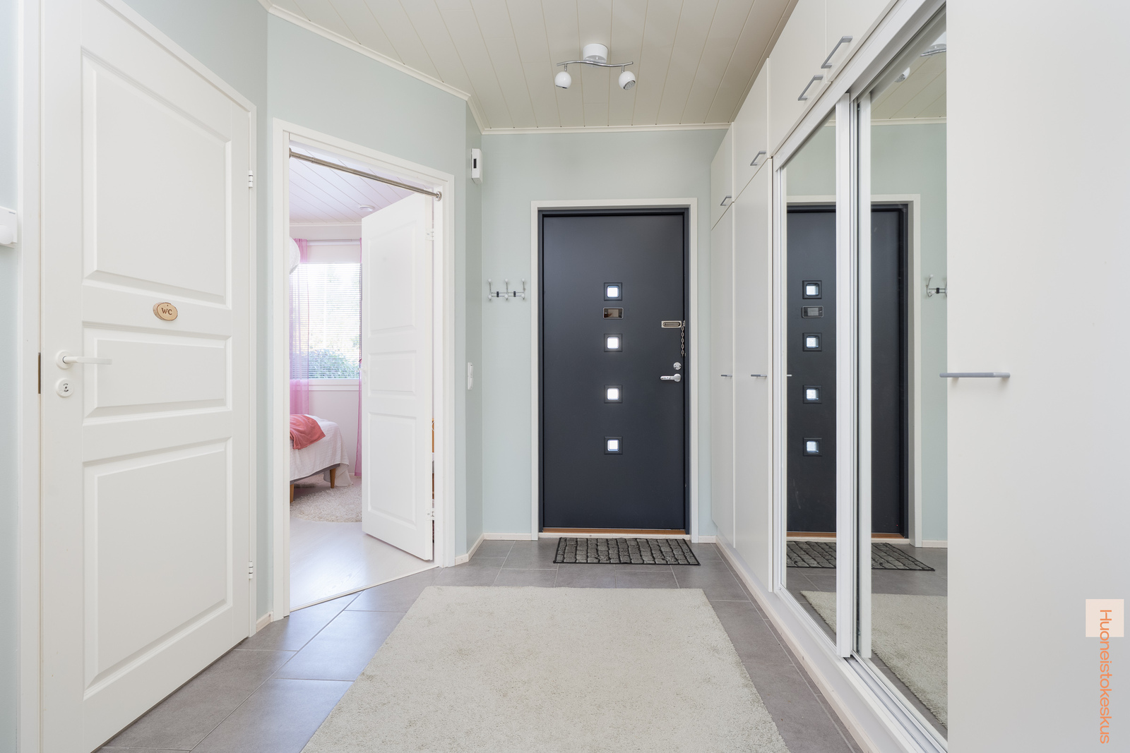Tässä viihtyisässä kodissa on kaksi makuuhuonetta kiinteillä kaapistoilla. Väljästä eteisestä löytyy myös hyvin säilytystilaa. Tyylikäs tumma keittiö, jossa tasot, allas, valaisimet ja osa kodinkoneista uusittu muutama vuosi sitten. Erillinen wc sekä toinen wc tilavan kylpyhuoneen yhteydessä. Kodinhoitohuoneesta ja keittiöstä kulku takaterassille, johon asennettu laadukkaat Lumonin lasitukset.