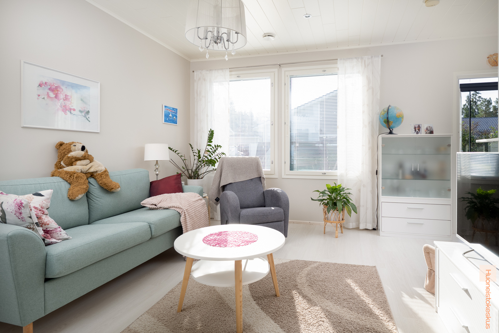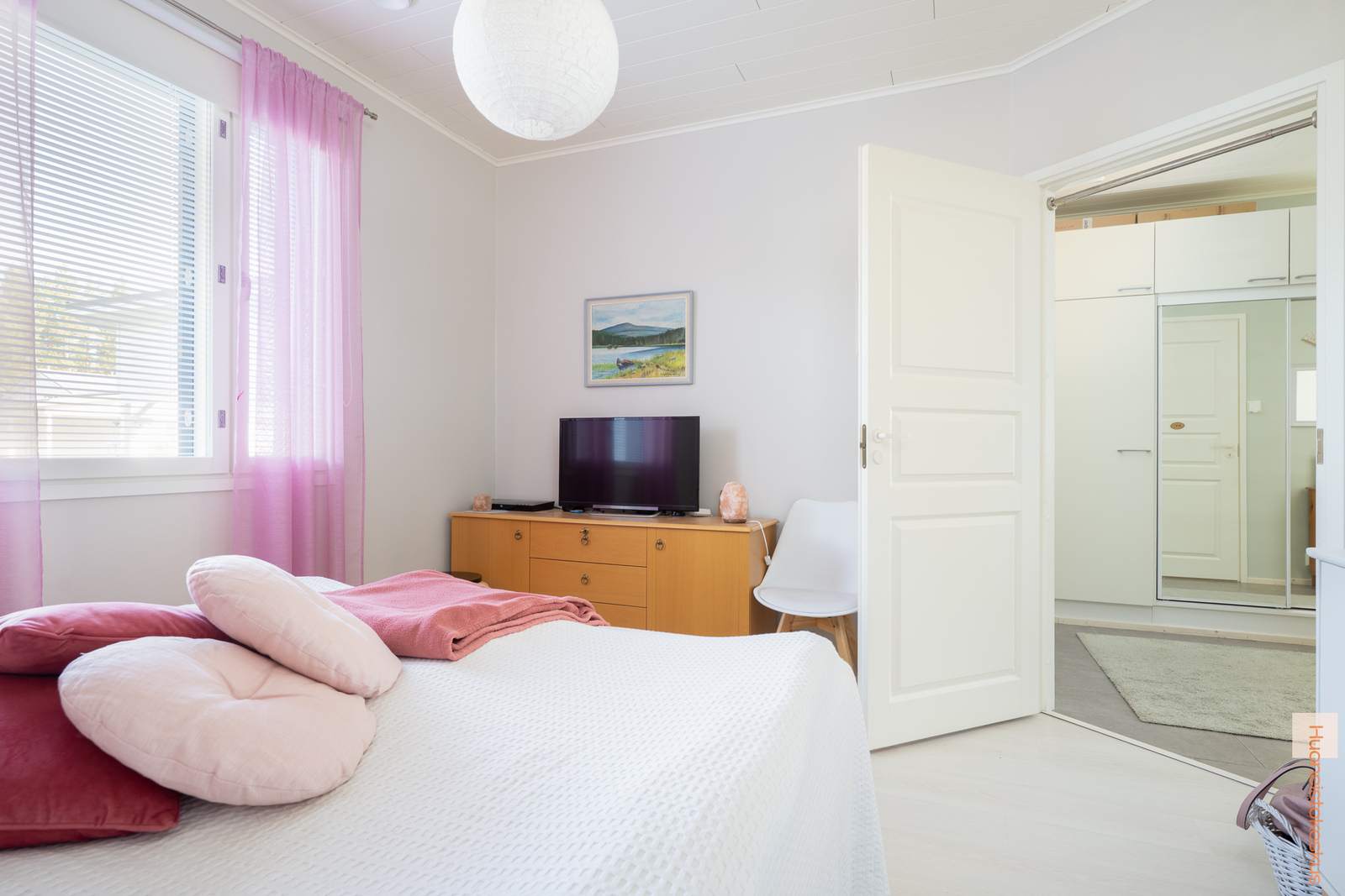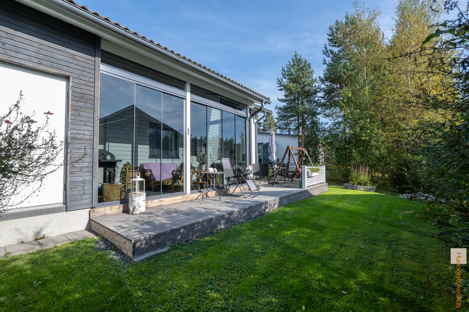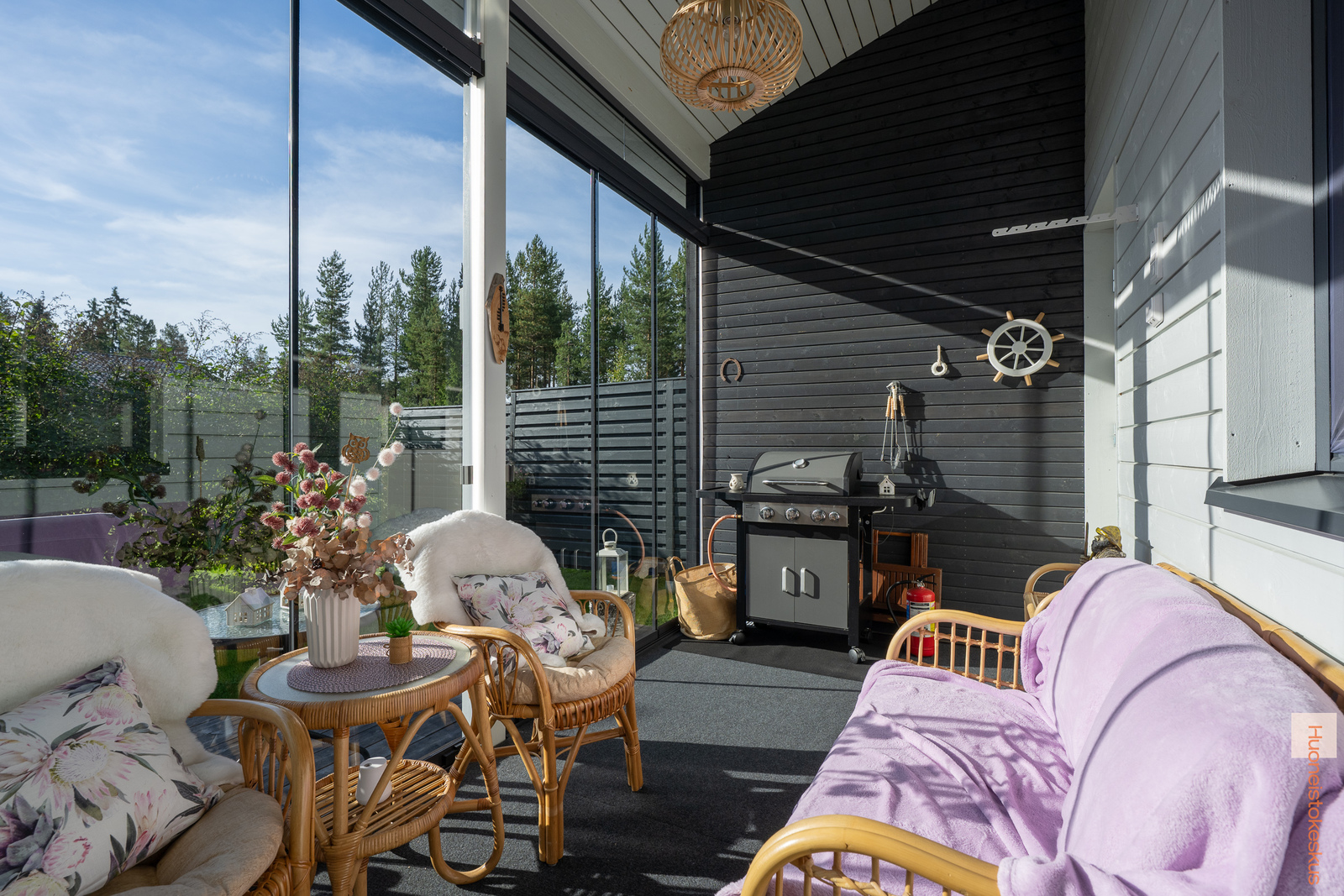 Tässä viihtyisässä kodissa on kaksi makuuhuonetta kiinteillä kaapistoilla. Väljästä eteisestä löytyy myös hyvin säilytystilaa. Tyylikäs tumma keittiö, jossa tasot, allas, valaisimet ja osa kodinkoneista uusittu muutama vuosi sitten. Erillinen wc sekä toinen wc tilavan kylpyhuoneen yhteydessä. Kodinhoitohuoneesta ja keittiöstä kulku takaterassille, johon asennettu laadukkaat Lumonin lasitukset.