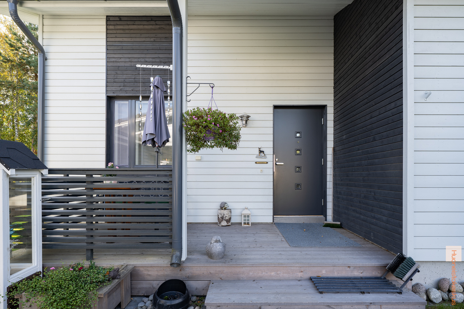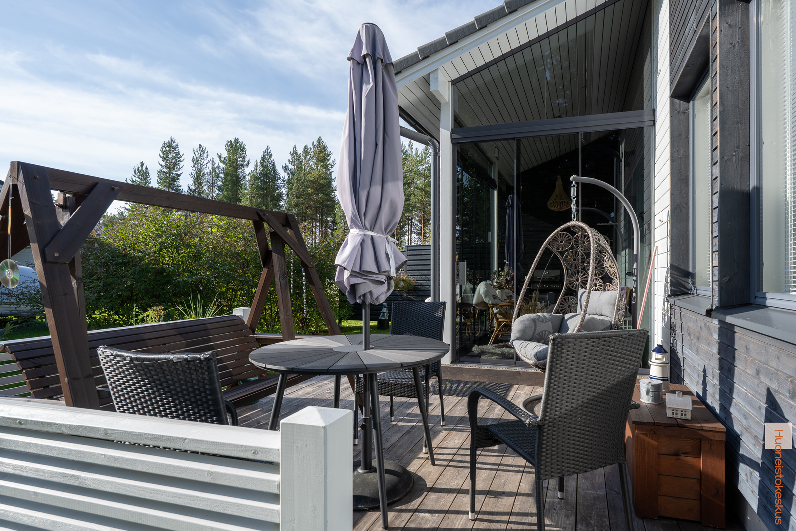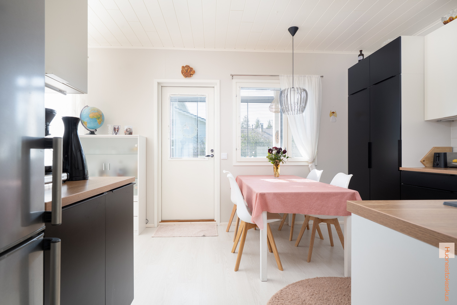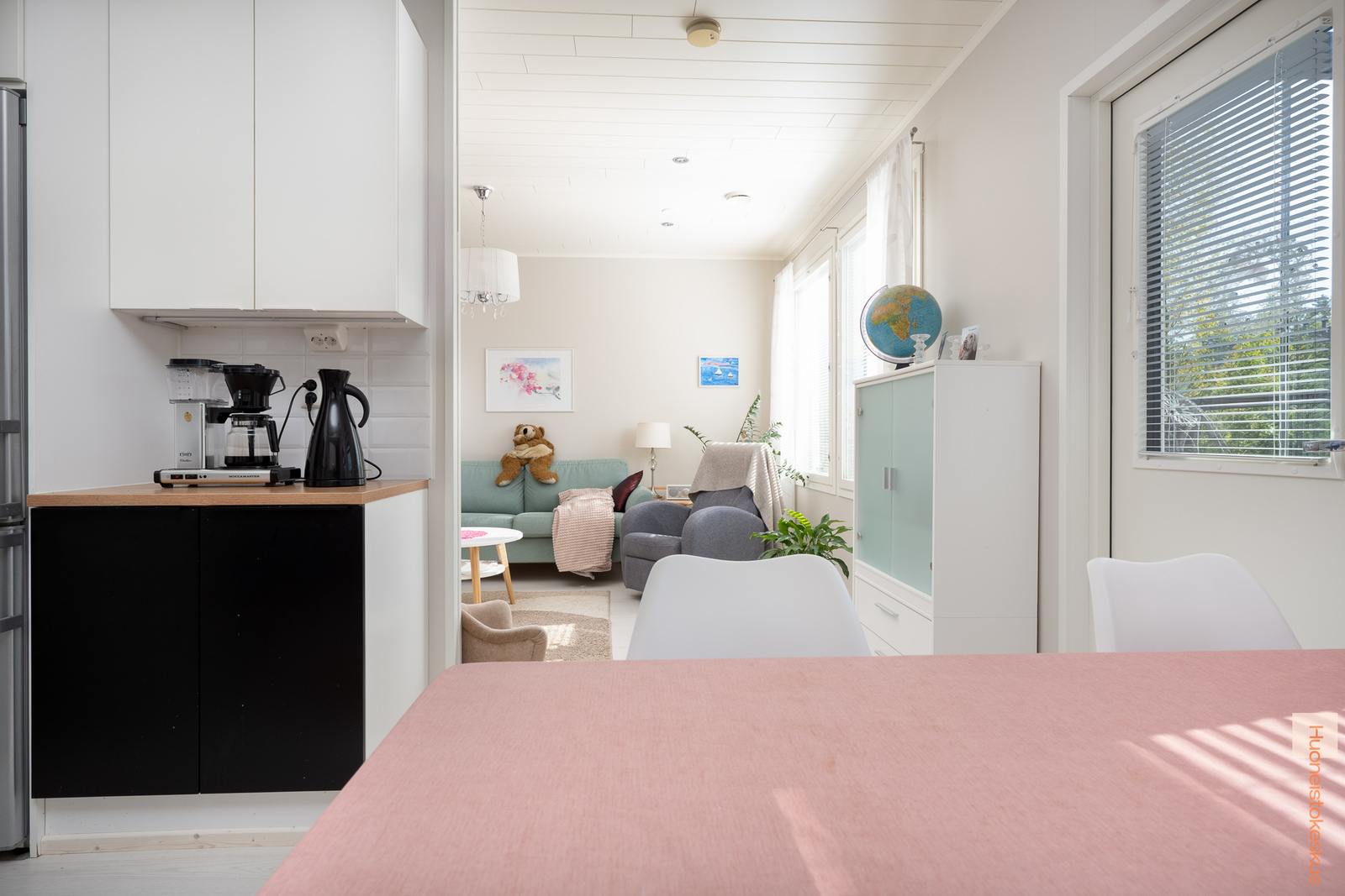 Tässä viihtyisässä kodissa on kaksi makuuhuonetta kiinteillä kaapistoilla. Väljästä eteisestä löytyy myös hyvin säilytystilaa. Tyylikäs tumma keittiö, jossa tasot, allas, valaisimet ja osa kodinkoneista uusittu muutama vuosi sitten. Erillinen wc sekä toinen wc tilavan kylpyhuoneen yhteydessä. Kodinhoitohuoneesta ja keittiöstä kulku takaterassille, johon asennettu laadukkaat Lumonin lasitukset.