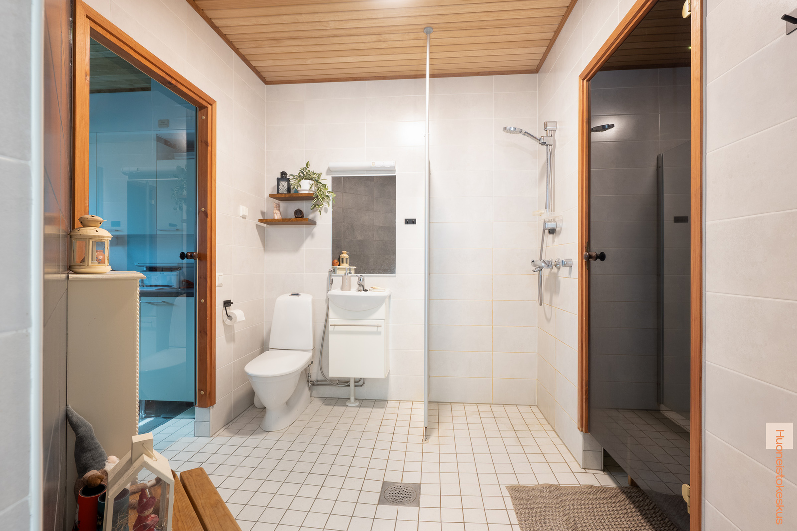 Lattialämmitys, peili, suihkuseinä, suihku, wc-istuin ja kiinteät valaisimet, seinät (kaakeli), lattiat (laatta) |