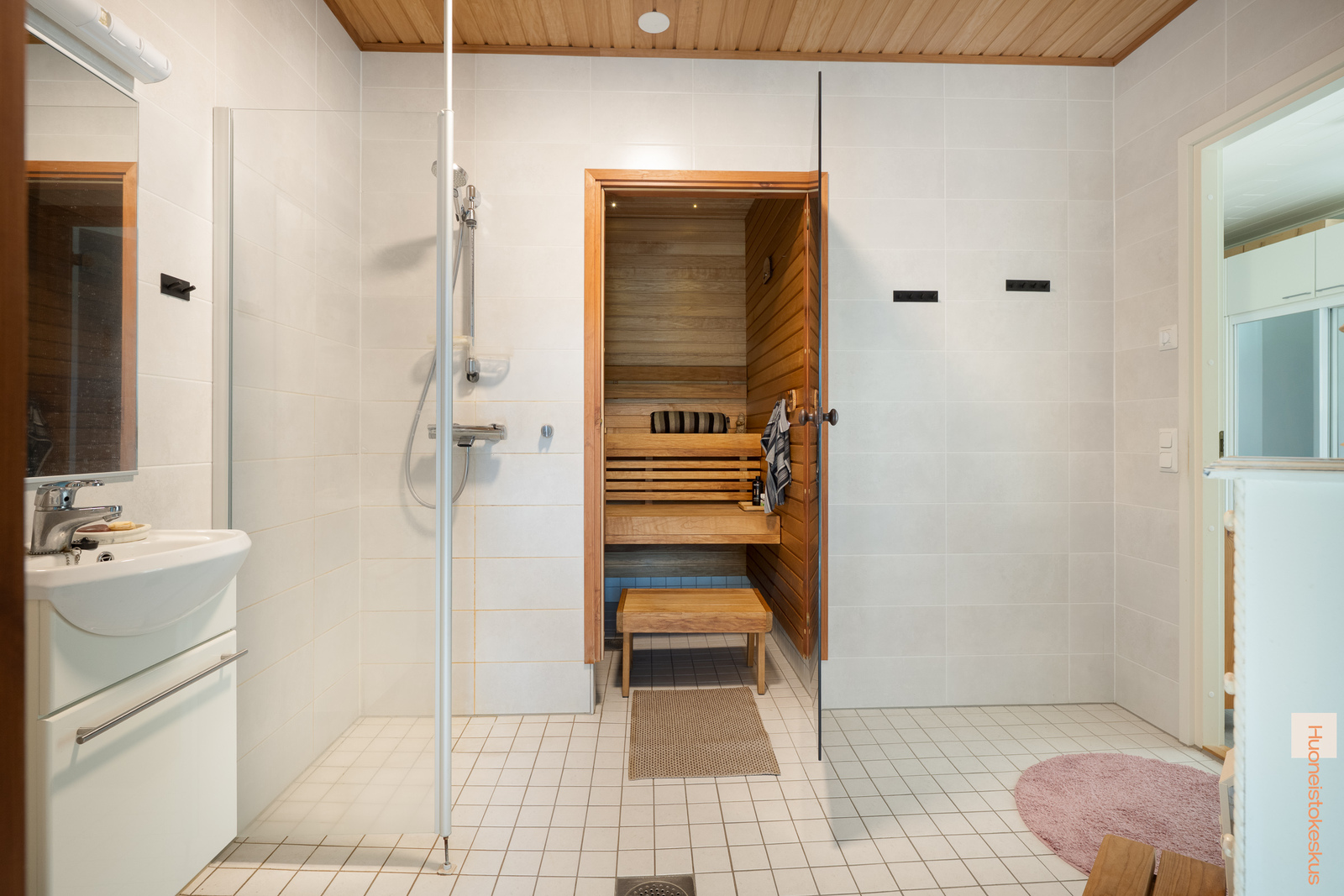 Saunassa puupaneeli, pesuhuoneessa kaakeli. Muissa tiloissa levyseinät tapetti/maalipinnalla. |