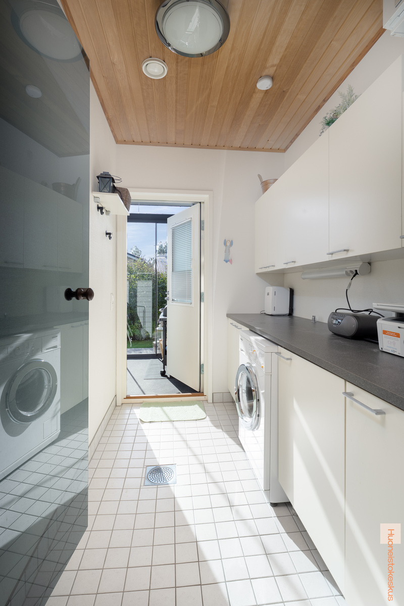 Lattialämmitys, pyykkikaapit, lattiakaivo, pöytätaso ja pesukoneliitäntä, lattiat (laatta), seinät (maali) |