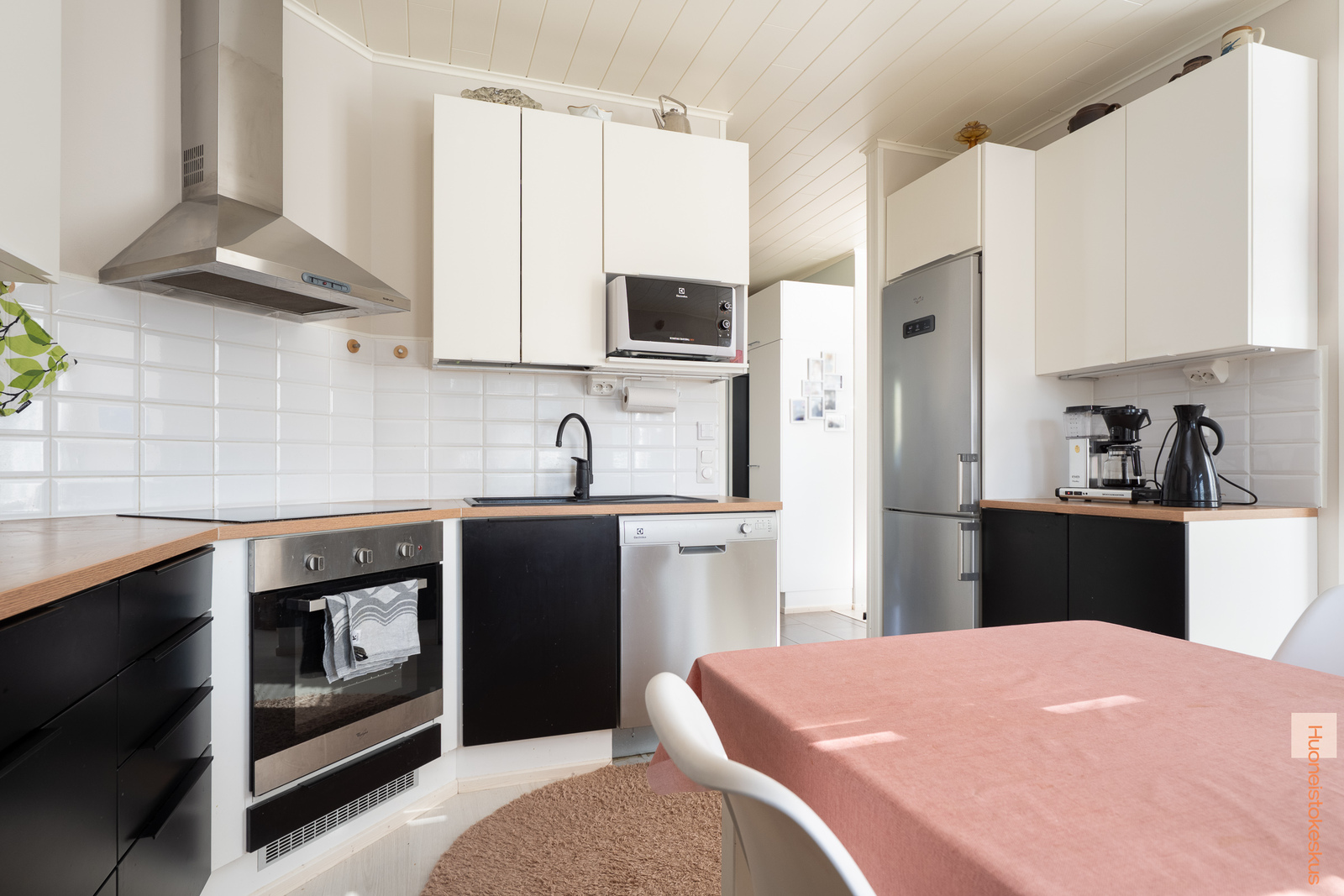Liesi (Induktioliesi ja erillisuuni), työtasot (laminaatti), seinät (maali), lattiat (laminaatti), jääkaappipakastin, erillisuuni, liesi, liesituuletin ja astianpesukone |