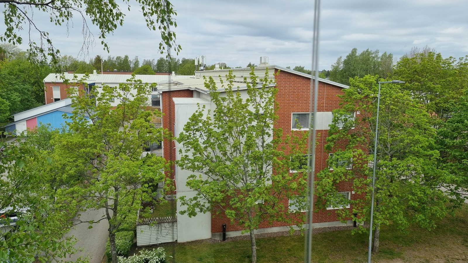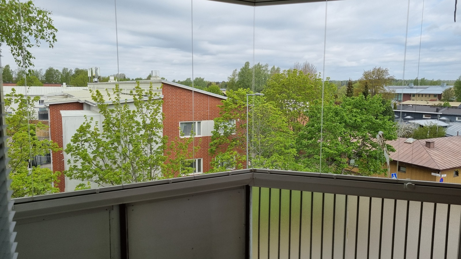 3/3 kerros. Lasitetulta länsiparvekkeelta näkymät viihtyisälle Viertolan pientaloalueelle päin.