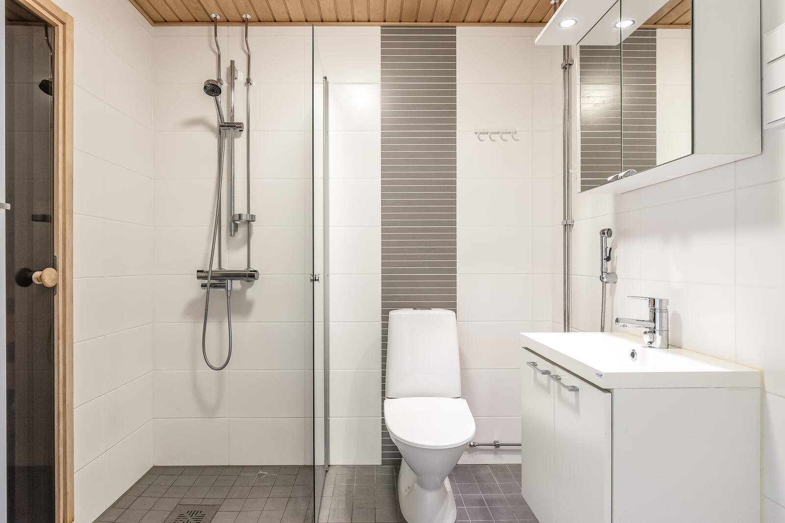 | Kylpyhuoneen kuvaus | Suihku, peilikaappi, wc-istuin, pesukoneliitäntä, allaskaappi, suihkuseinä, lattialämmitys ja kiinteät valaisimet, seinät (kaakeli), lattiat (laatta) |