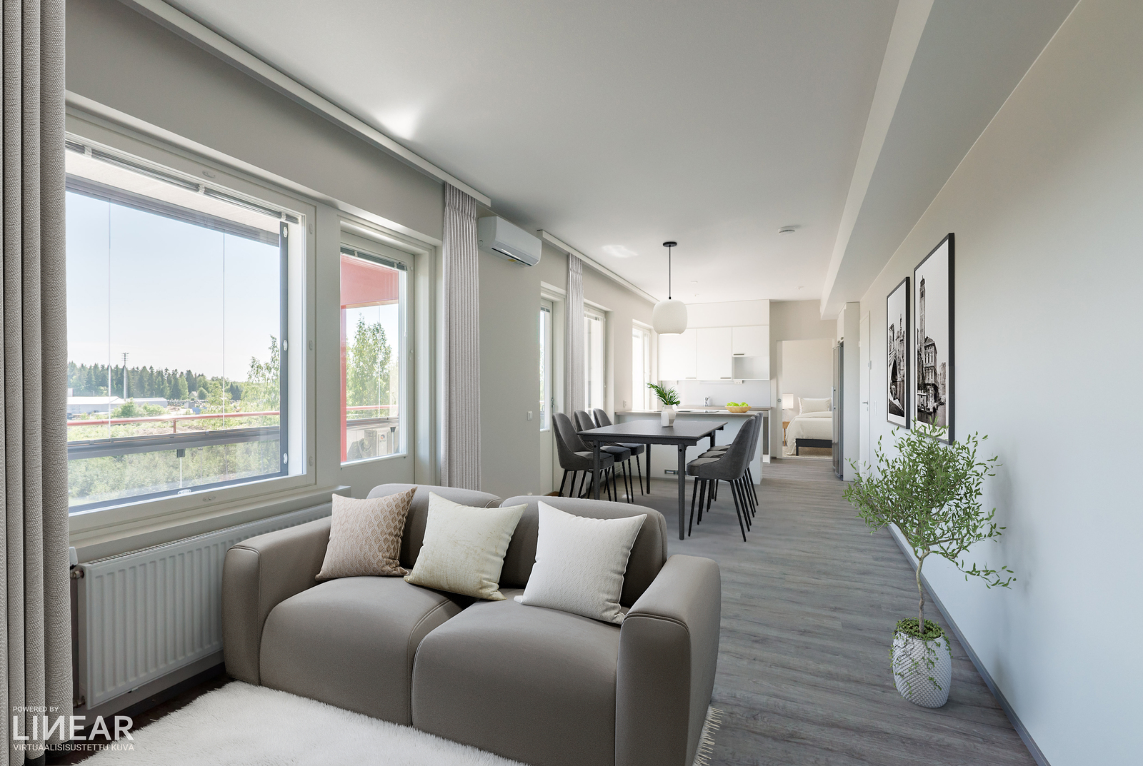 Penttilästä nyt tarjolla iso saunallinen kolmio seuraavia asukkaita palvelemaan. Käytännössä kuin uusi ja erittäin siististi pidetty asunto toimii erinomaisesti myös perhearkeen, tästä pitää huolen riittävän suuri kylpyhuone yhdistettynä kodinhoitohuonetilaan. Ikkunallinen sauna tuomassa arjen luksusta hektisyyden vastapainoksi. Olohuoneen yhteydestä käynti suurelle lasitetulle parvekkeelle. Keittiössä erillinen saareke tuomassa lisälaskutilaa sekä päämakuuhuoneen yhteydessä myös vaatehuone kodintekstiileille sekä vaatteille. Huoneistoon on myös asennettu viilentävä ilmalämpöpumppu tuomaan asuinviihtyvyyttä kesän helteitä ajatellen.