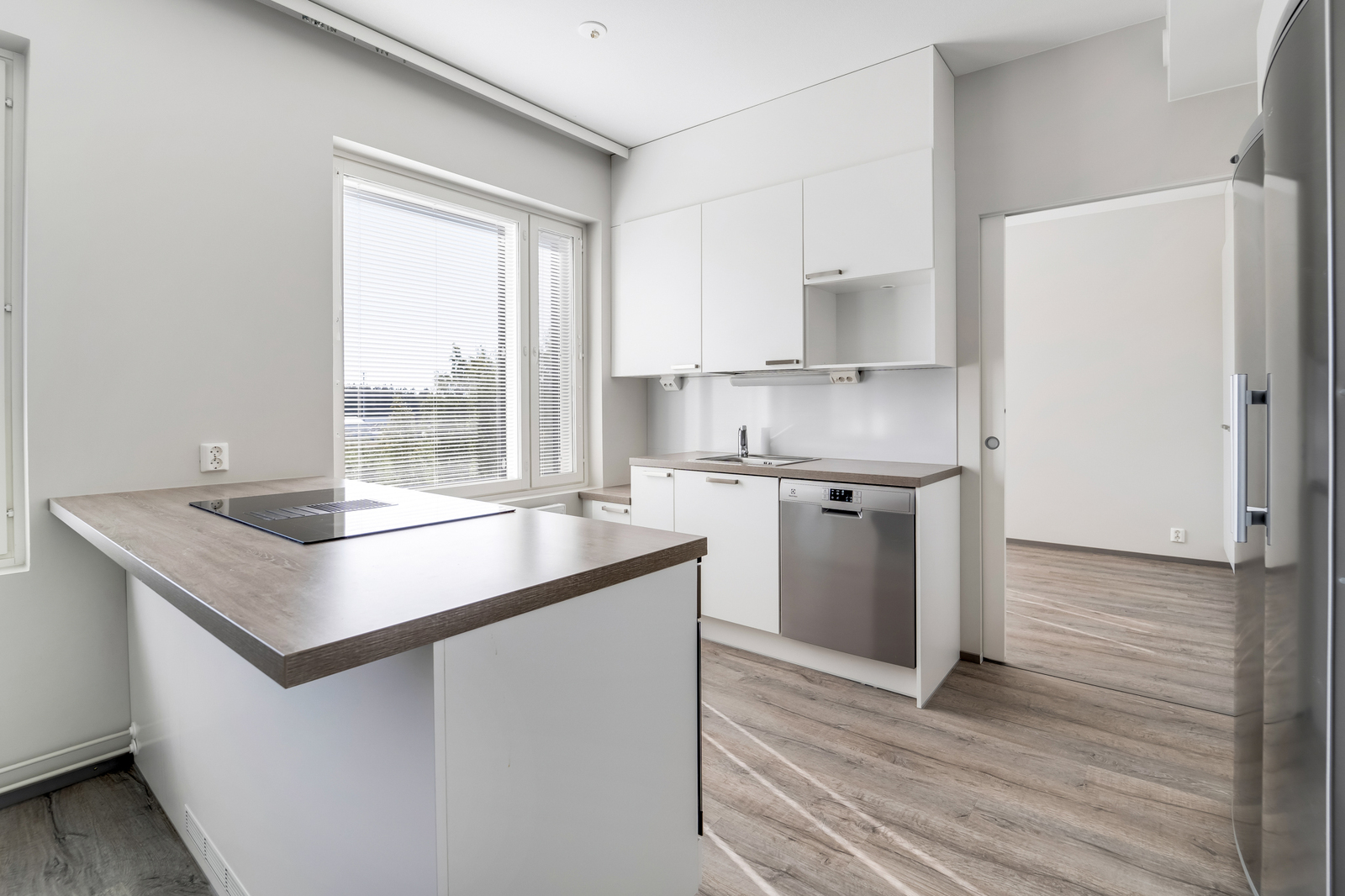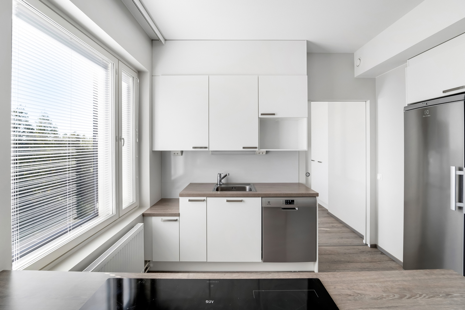 Liesi (liesitaso, erillisuuni), työtasot (laminaatti), seinät (maali), lattiat (vinyyli), erillisuuni, liesituuletin, erillinen pakastin, astianpesukone, jääkaappi ja liesitaso, kiinteät valaisimet, Valkoiset kaapistot rosterisine kodinkoneineen. |
