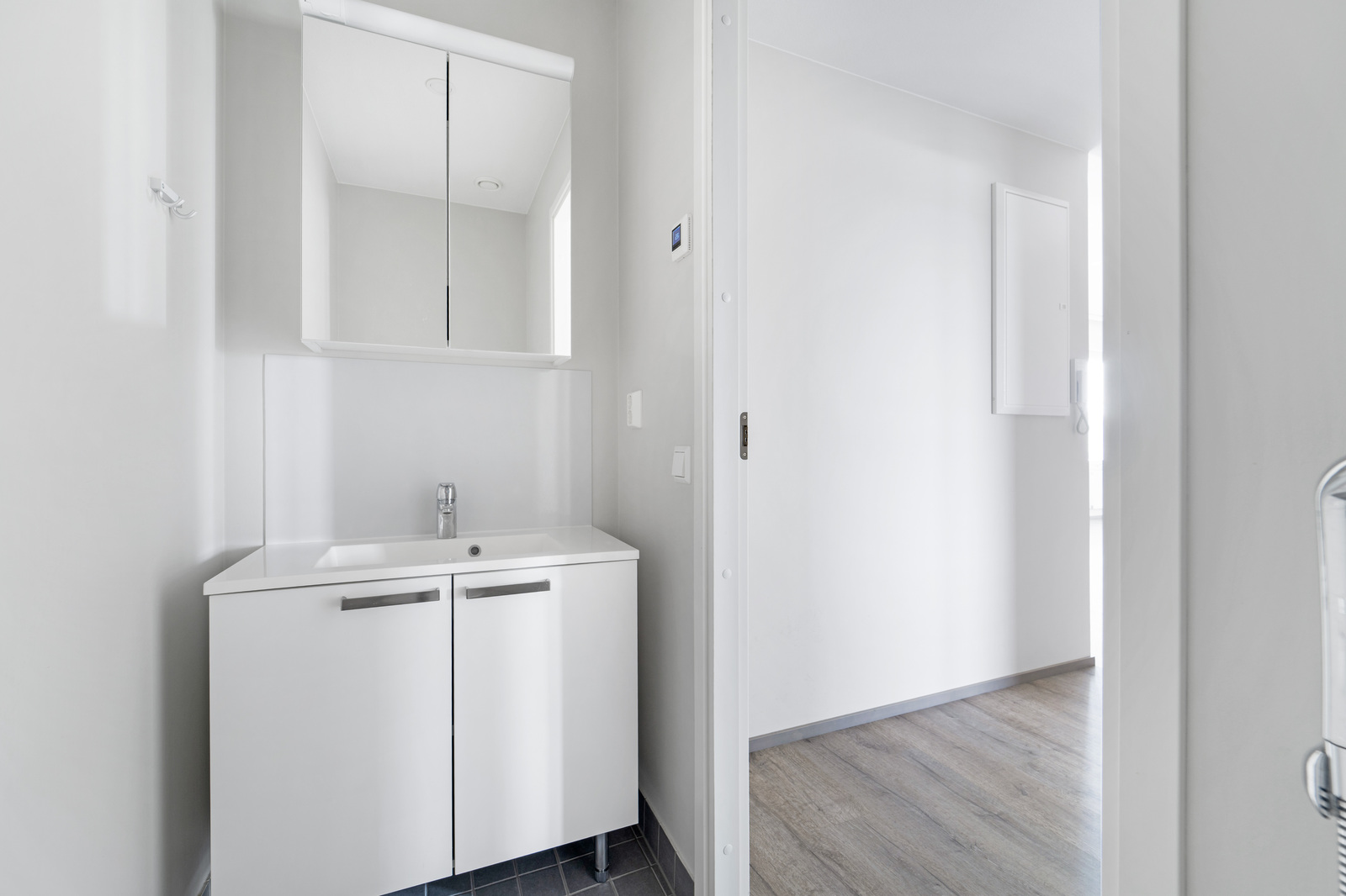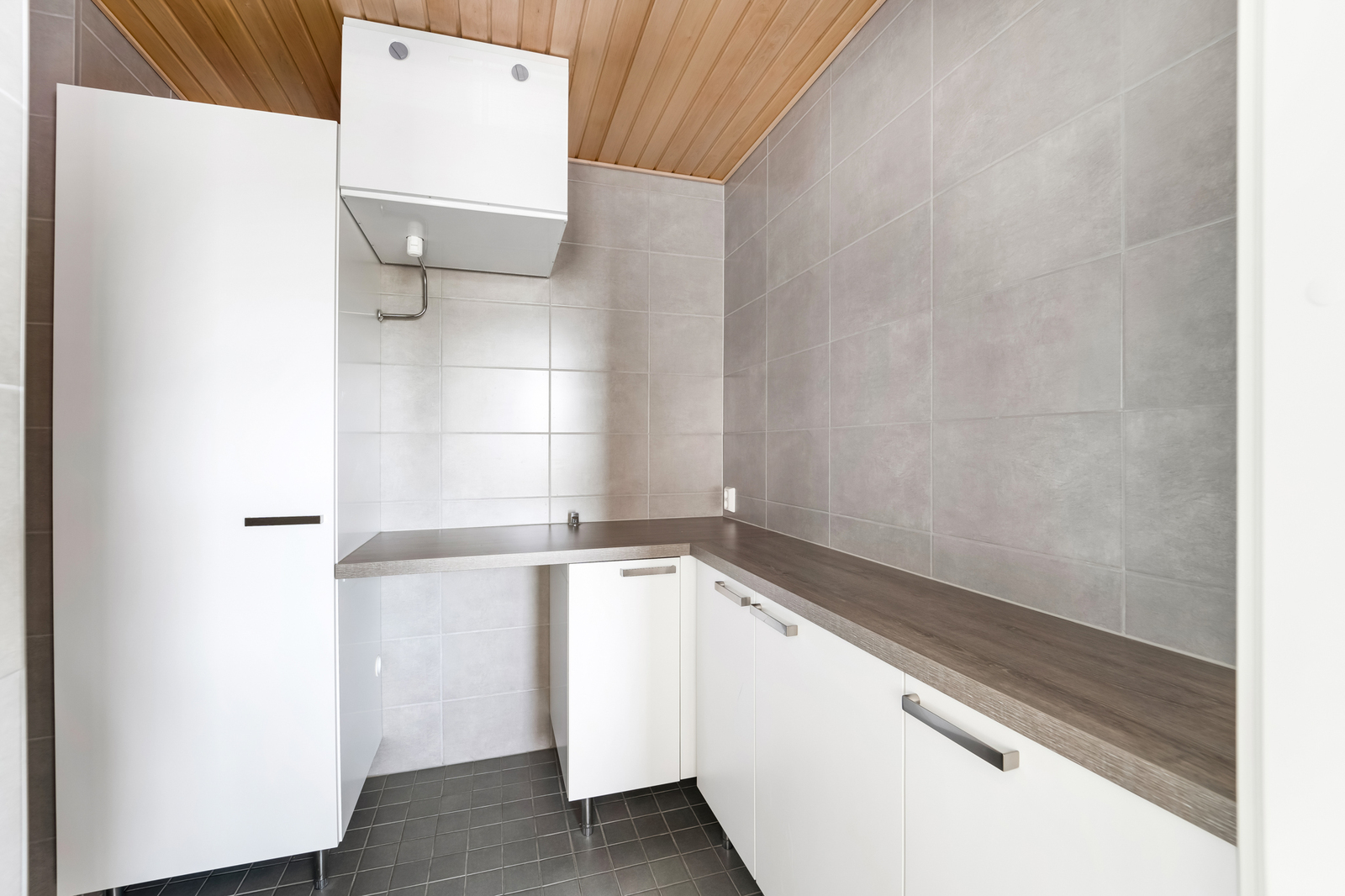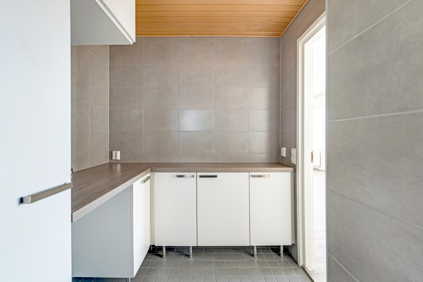 Suihkuseinä, lattialämmitys, suihku, pesukoneliitäntä, wc-istuin, peilikaappi, allaskaappi ja kiinteät valaisimet, seinät (kaakeli), lattiat (laatta), Kylpyhuoneen yhteydessä kodinhoitohuonetila etualalla reiluin kaappitiloin varustettuna. |