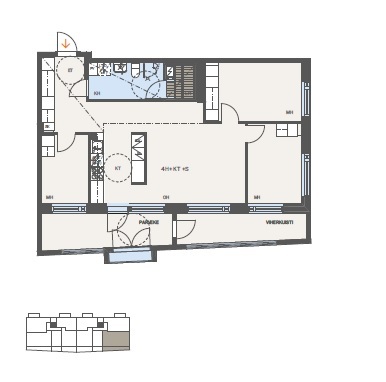 | Huoneistoselitelmä | 4 h, avokeittiö, pesutilat, sauna, iso lasitettu parveke ( yht.järj. 4 h + kt + s ). |