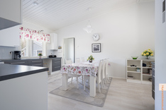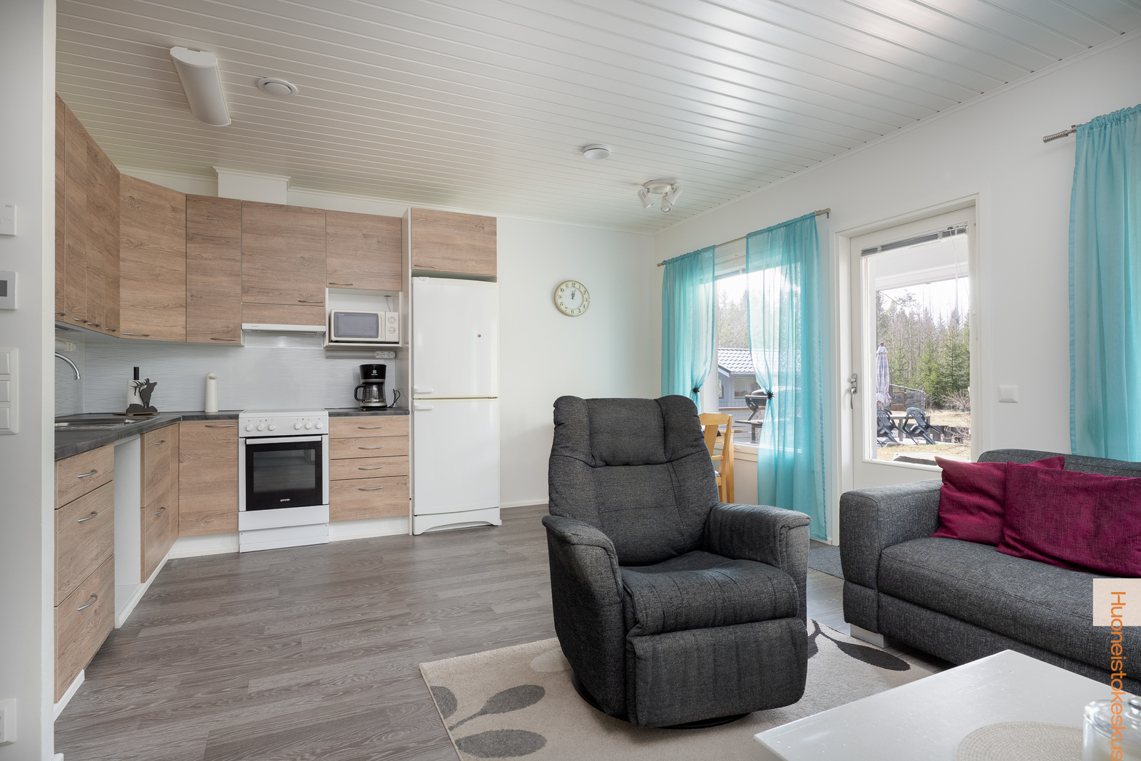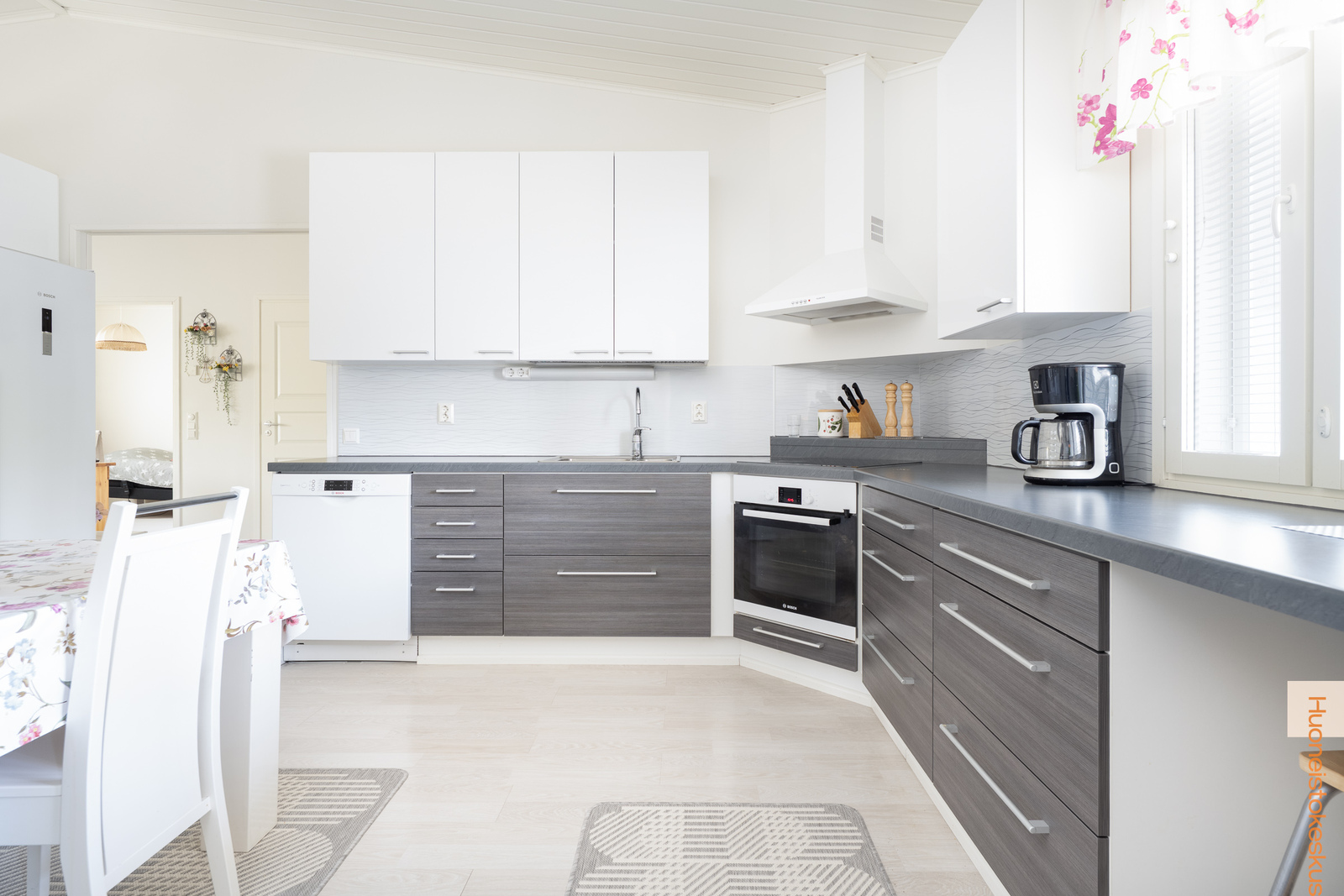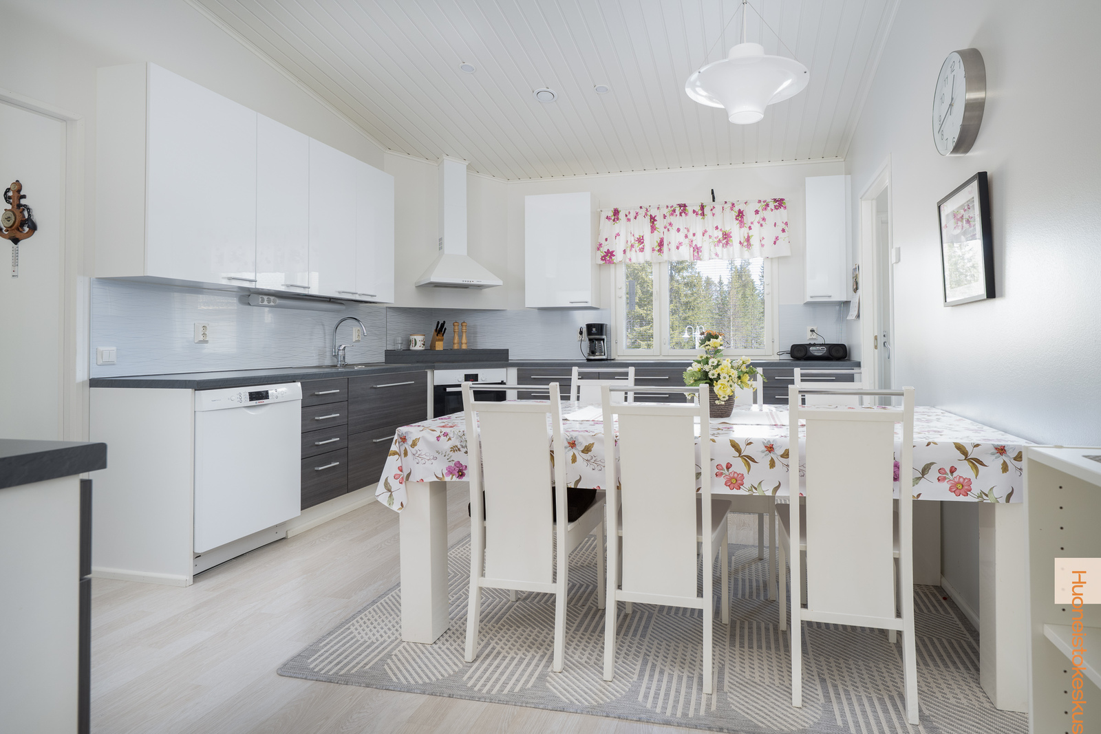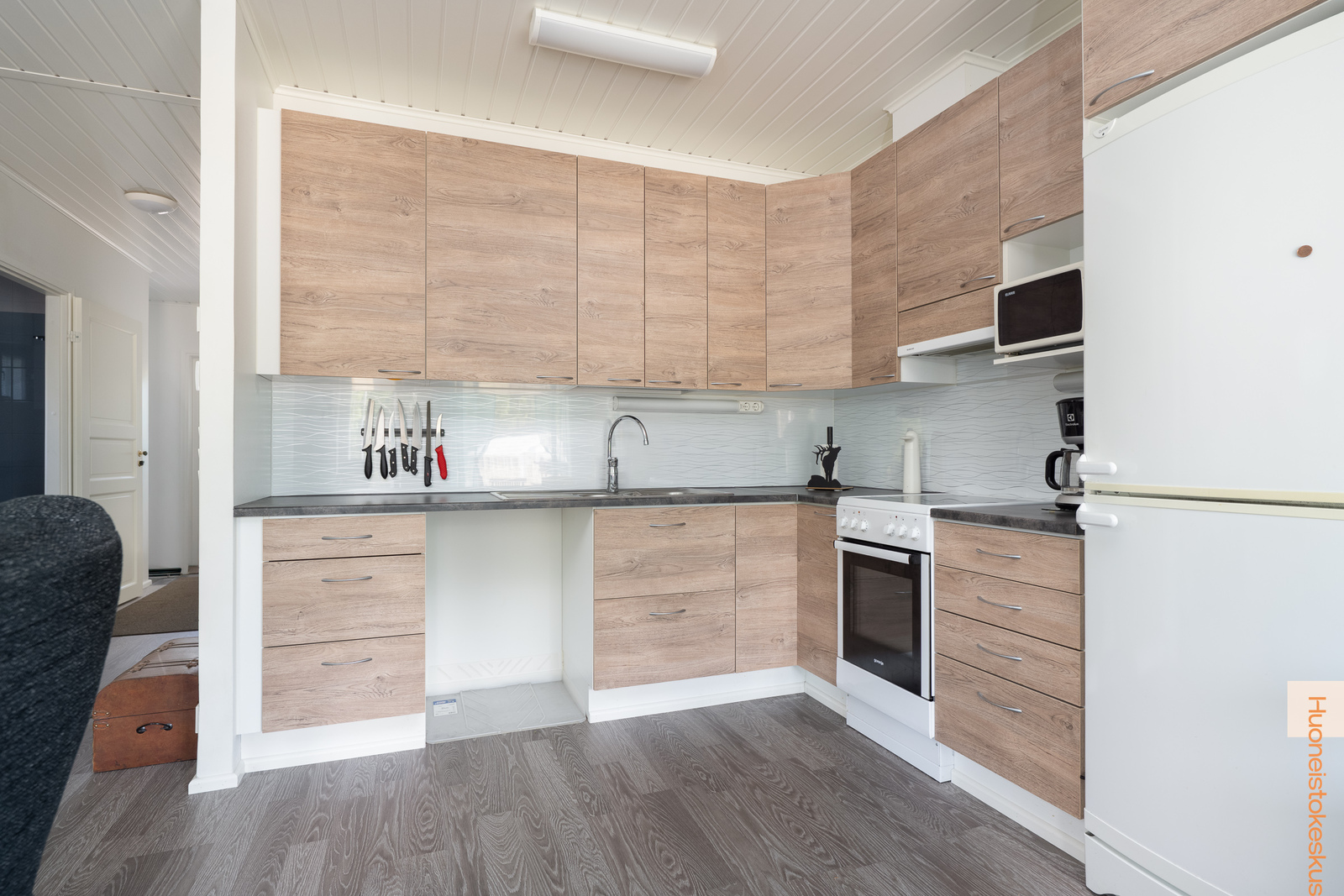 | Keittiön kuvaus | Liesi (Induktioliesi ja erillisuuni), työtasot (laminaatti), seinät (maali), lattiat (laminaatti), erillisuuni, jääkaappi, erillinen pakastin, liesi, astianpesukone ja liesituuletin / hormi, kiinteät valaisimet |