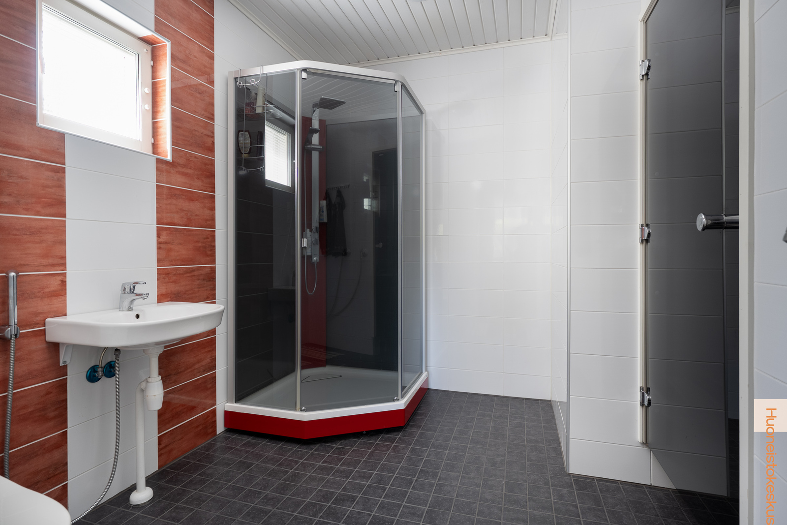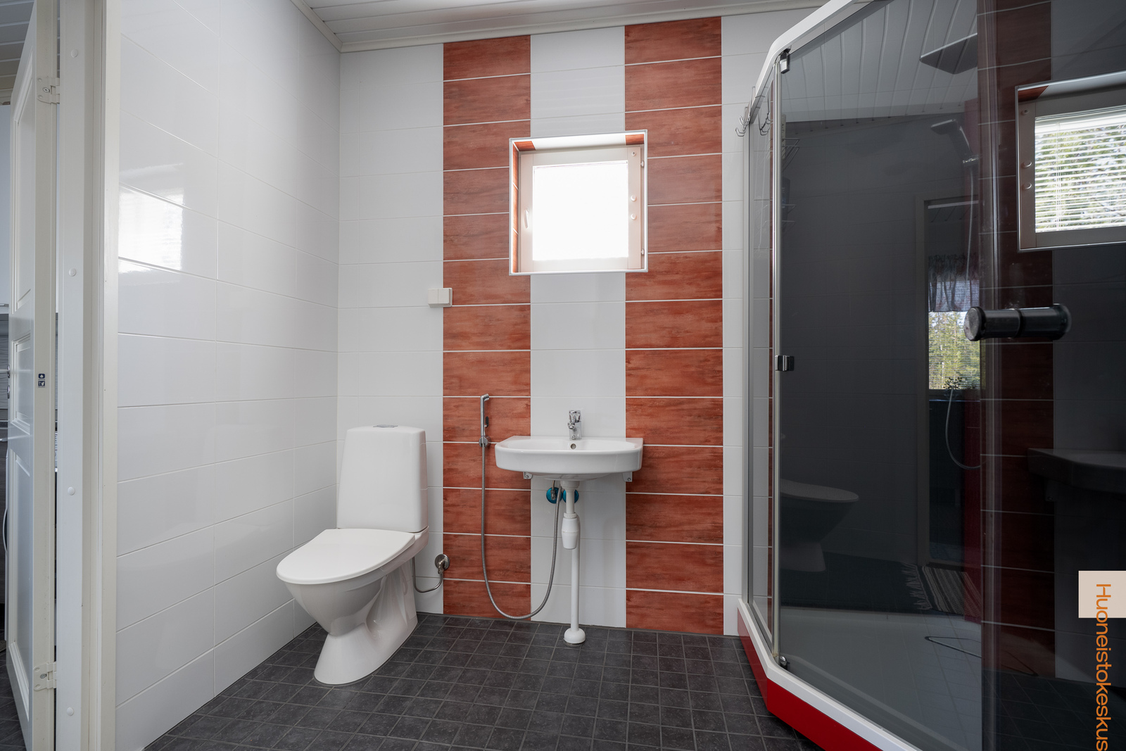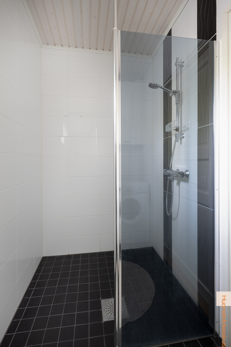 | Kylpyhuoneen kuvaus | Suihkukaappi, wc-istuin, lattialämmitys ja kiinteät valaisimet, seinät (kaakeli), lattiat (laatta) |