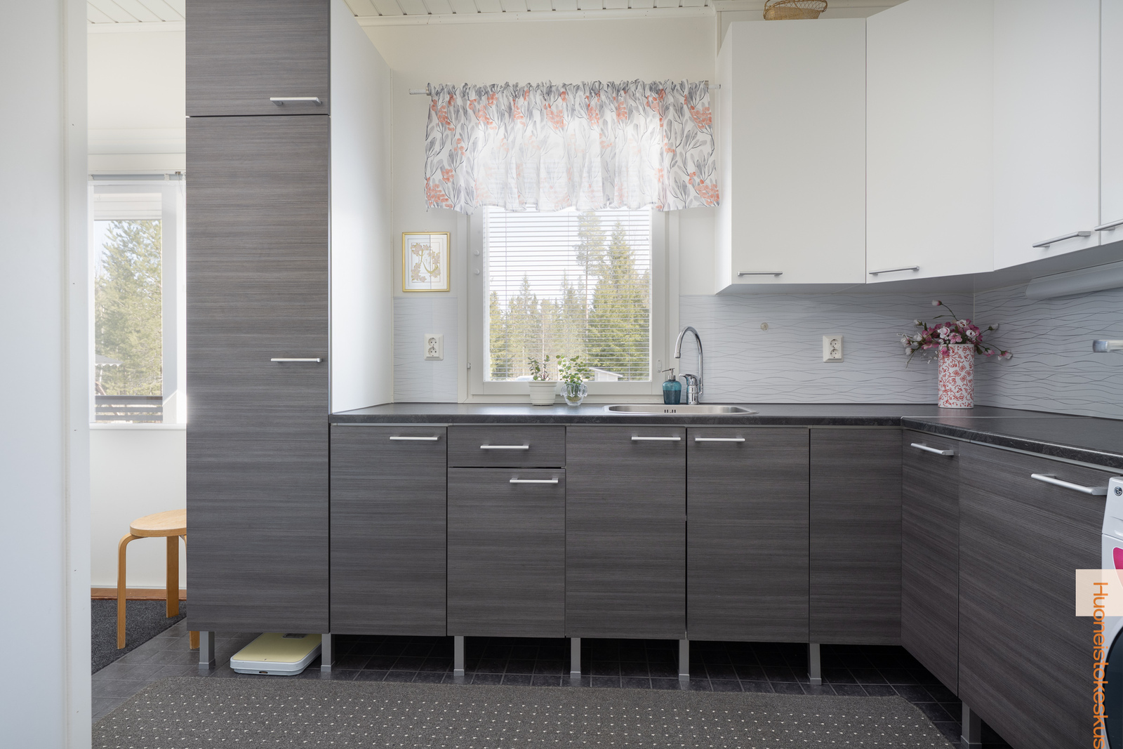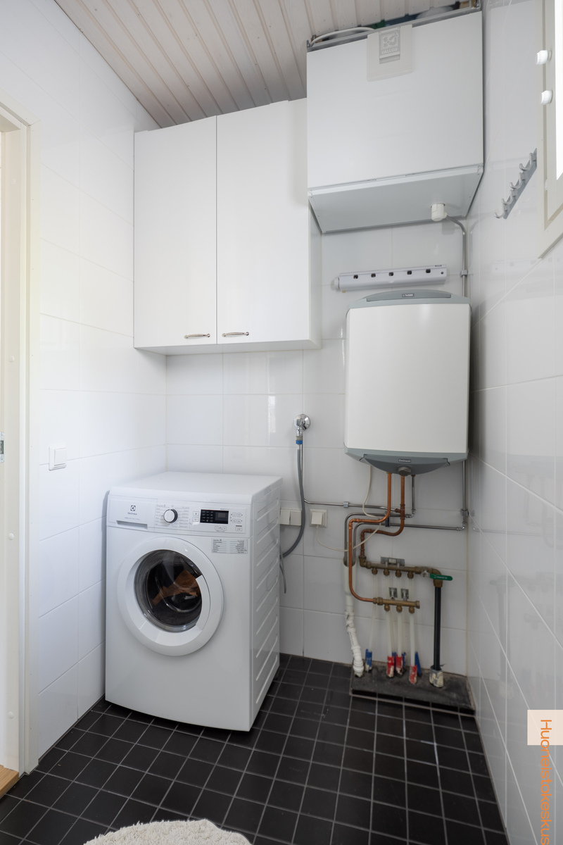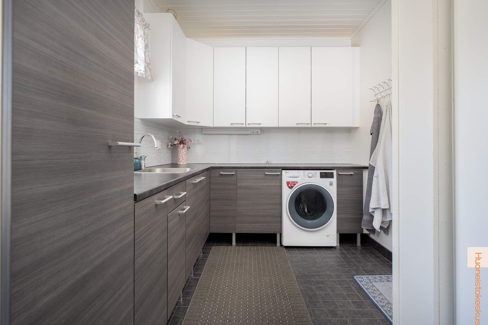 | Kodinhoitohuoneen kuvaus | Pesuallas, silityspöytä/taso, lattialämmitys, pesukoneliitäntä, lattiakaivo, pyykkikaapit ja pöytätaso, lattiat (laatta), seinät (maali) |