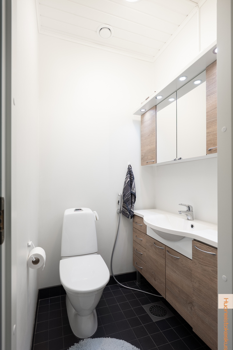 | WC-tilojen kuvaus | Lukumäärä: 2, Lattiakaivo, bidee-suihku, peilikaappi ja lattialämmitys, seinät (Kaakeli), lattiat (Laatta) |