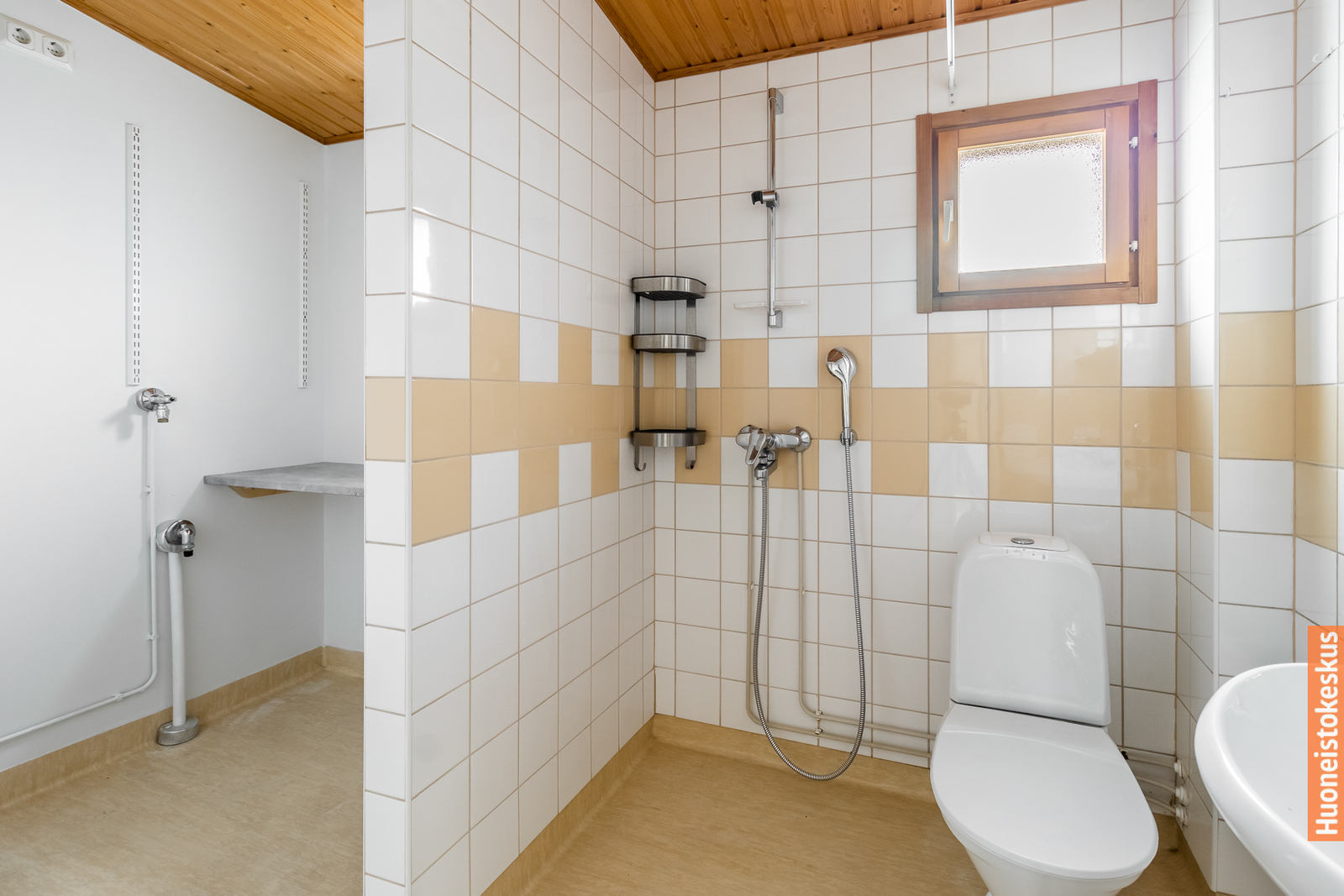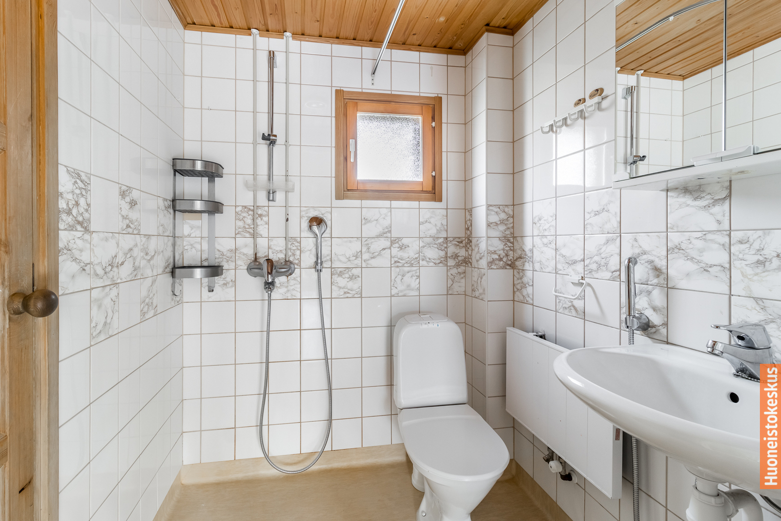 | Kylpyhuoneen kuvaus | Suihku, wc-istuin ja peilikaappi, seinät (kaakeli), lattiat (muovimatto) |