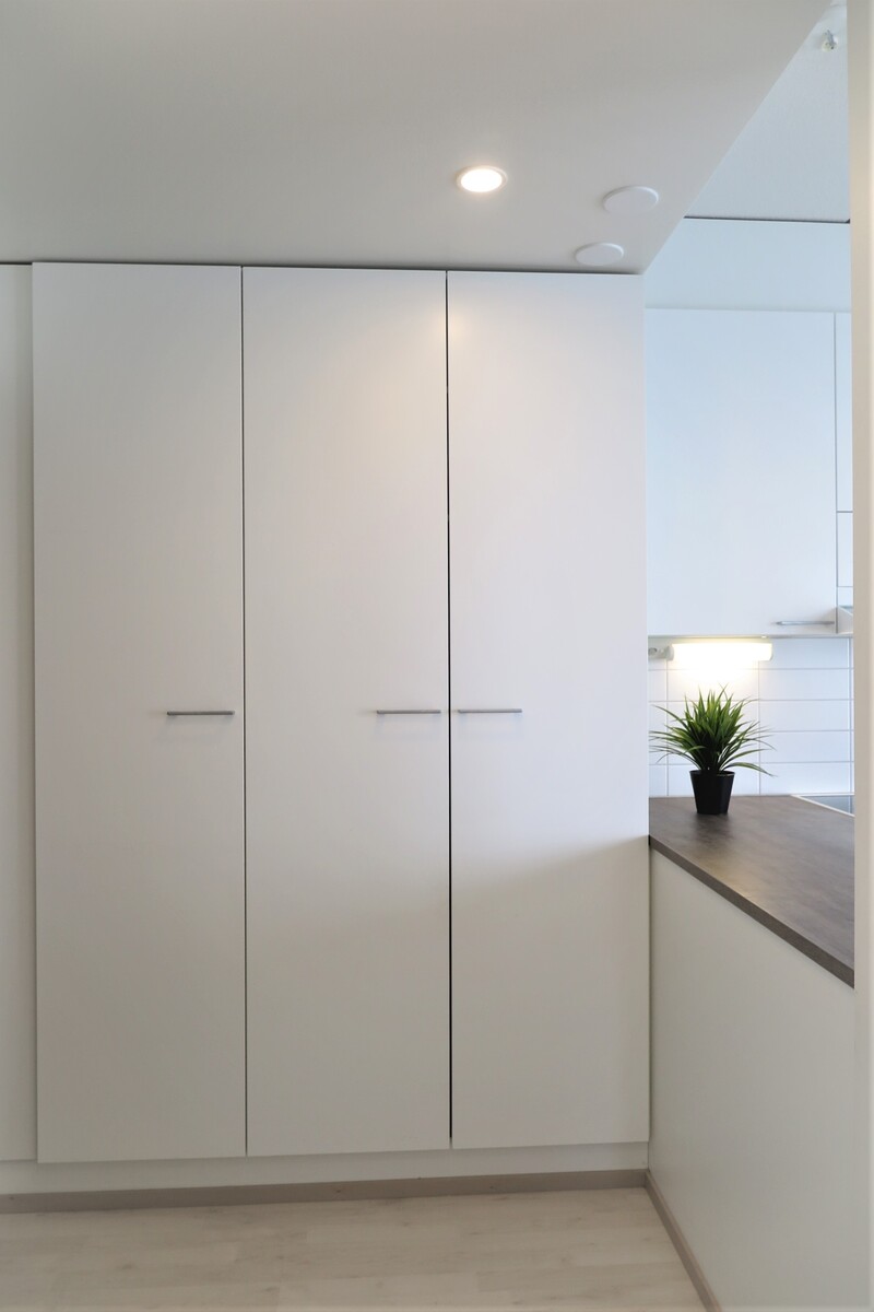 Vaatehuone ja eteistilassa isot säilytyskaapistot. |