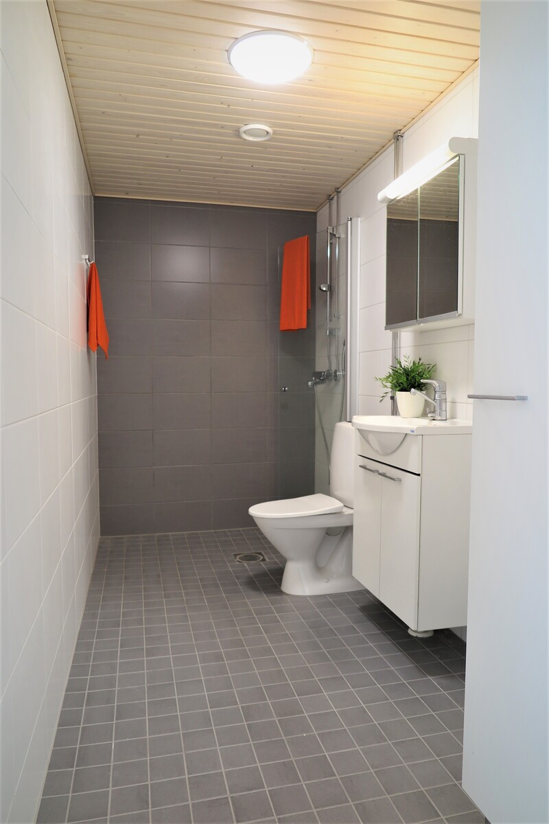 Allaskaappi, wc-istuin, pesukoneliitäntä, suihkuseinä, lattialämmitys, peilikaappi, suihku ja kiinteät valaisimet, seinät (kaakeli), lattiat (laatta) |