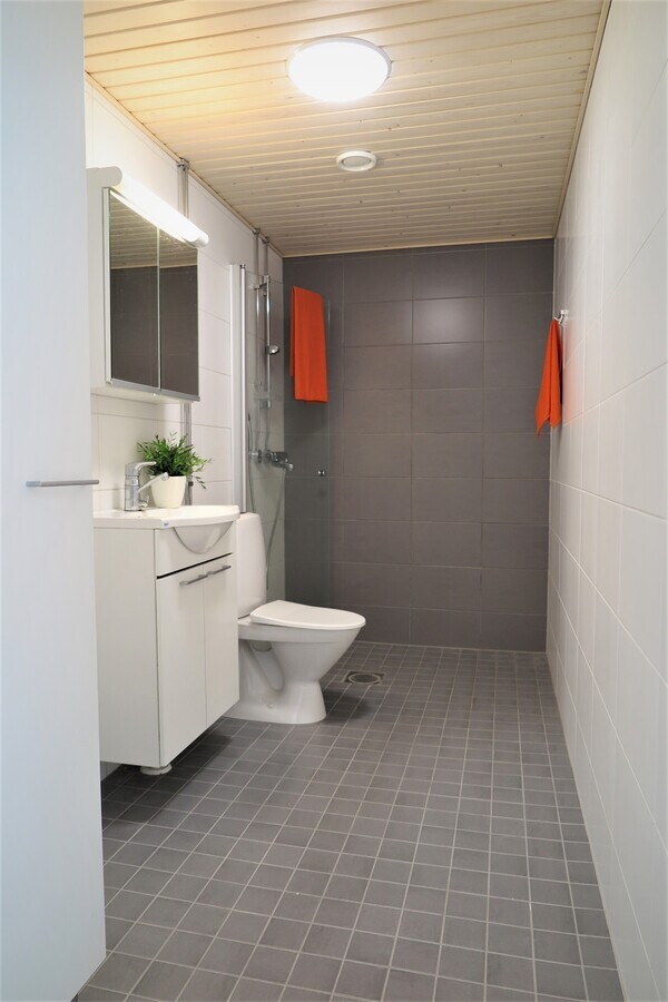 | Kylpyhuoneen kuvaus | Allaskaappi, wc-istuin, pesukoneliitäntä, lattialämmitys, peilikaappi, suihku ja kiinteät valaisimet, seinät (kaakeli), lattiat (laatta) |