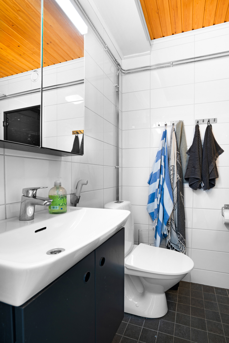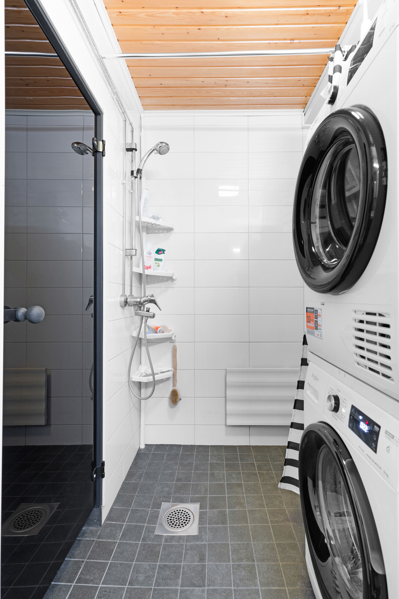 | Kylpyhuoneen kuvaus | Peilikaappi, wc-istuin, suihku, pesukoneliitäntä ja kiinteät valaisimet, seinät (kaakeli), lattiat (laatta) |