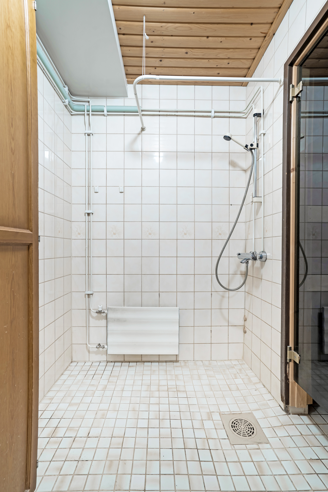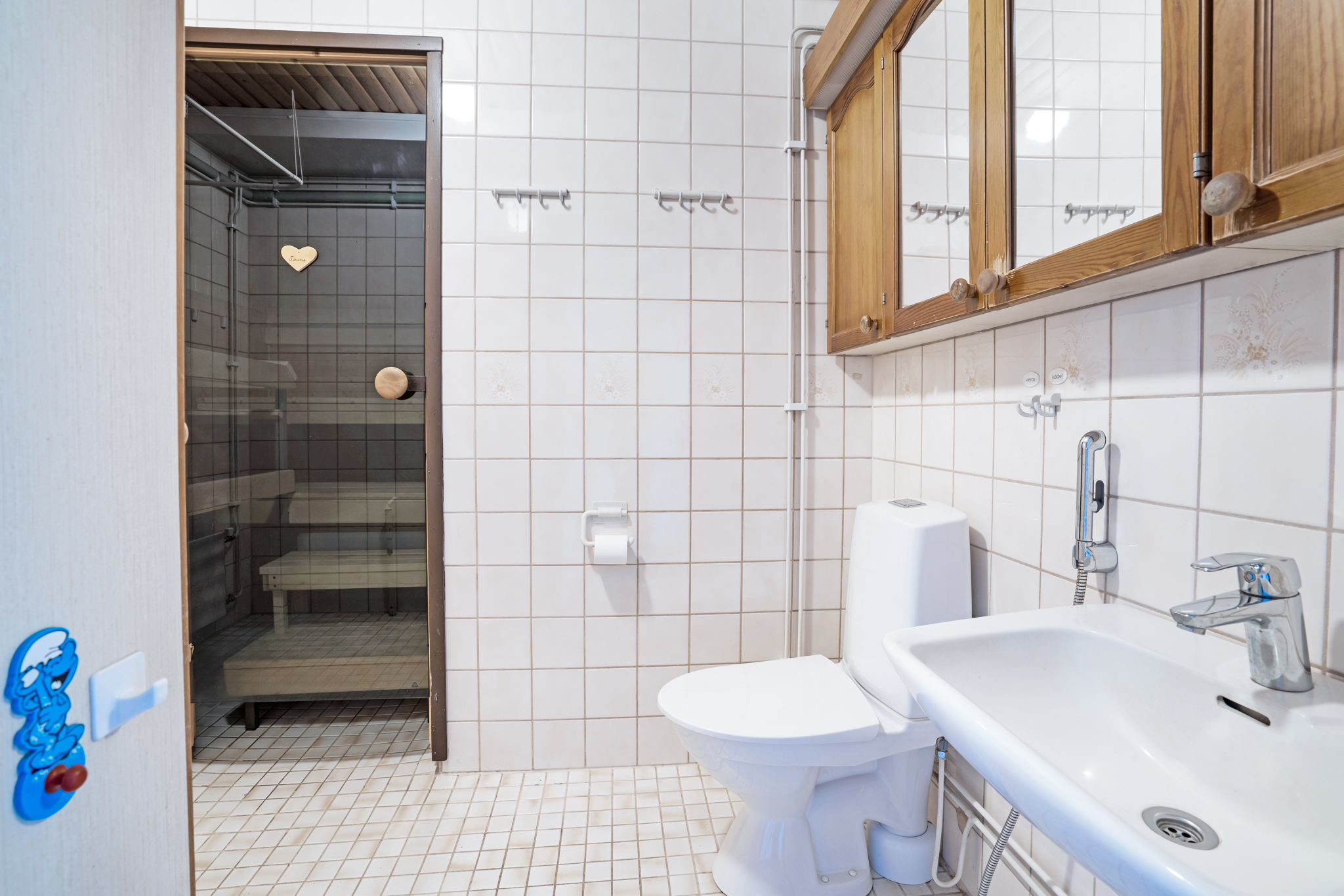 | Kylpyhuoneen kuvaus | WC-istuin, suihku, peilikaappi, bidee-suihku ja pesuallas, seinät (kaakeli), lattiat (laatta) |