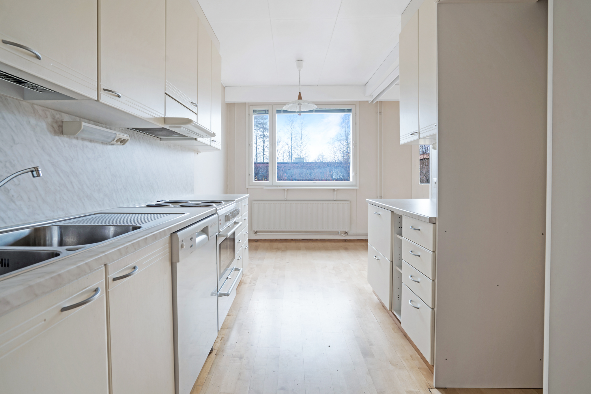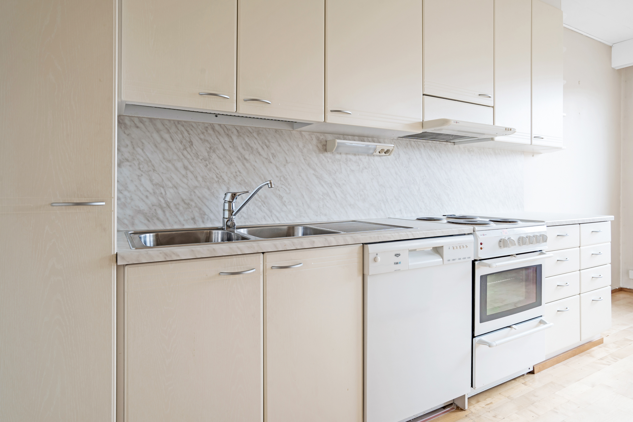 | Keittiön kuvaus | Liesi (Sähköhella), työtasot (laminaatti), seinät (maali), lattiat (parketti), liesituuletin ja astianpesukone |