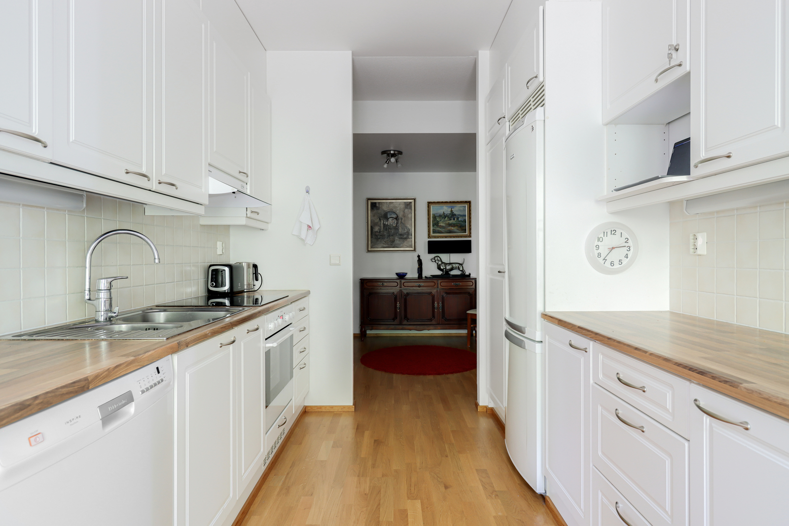 Liesi (liesitaso, erillisuuni), työtasot (puu), seinät (maali ja osalaatoitus), lattiat (parketti), erillisuuni, liesituuletin, jääkaappipakastin, astianpesukone ja liesitaso, kiinteät valaisimet (induktio) |