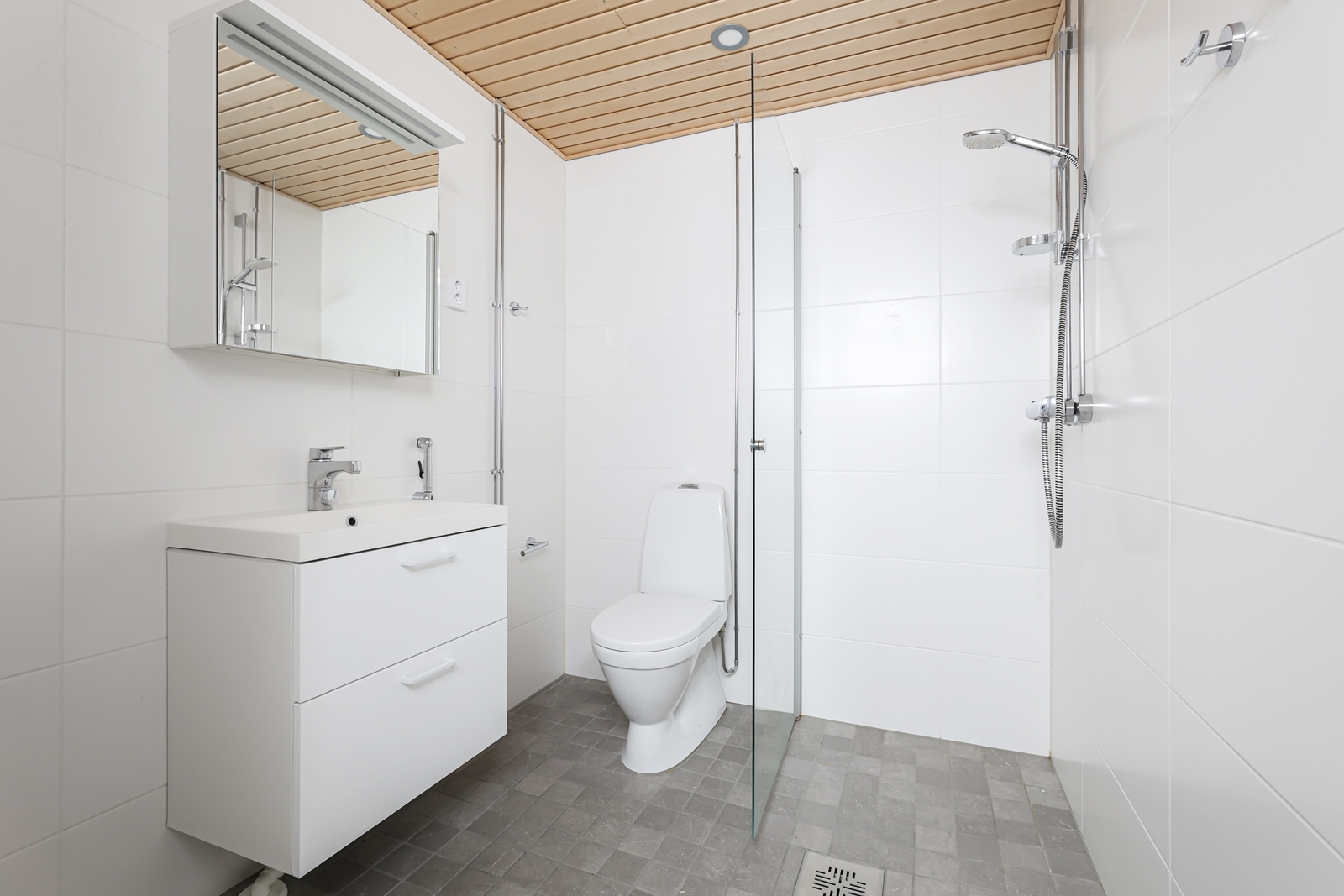 | Kylpyhuoneen kuvaus | WC-istuin, lattialämmitys, allaskaappi, peilikaappi, suihkuseinä, pesukoneliitäntä, suihku ja kiinteät valaisimet, seinät (kaakeli), lattiat (laatta) |