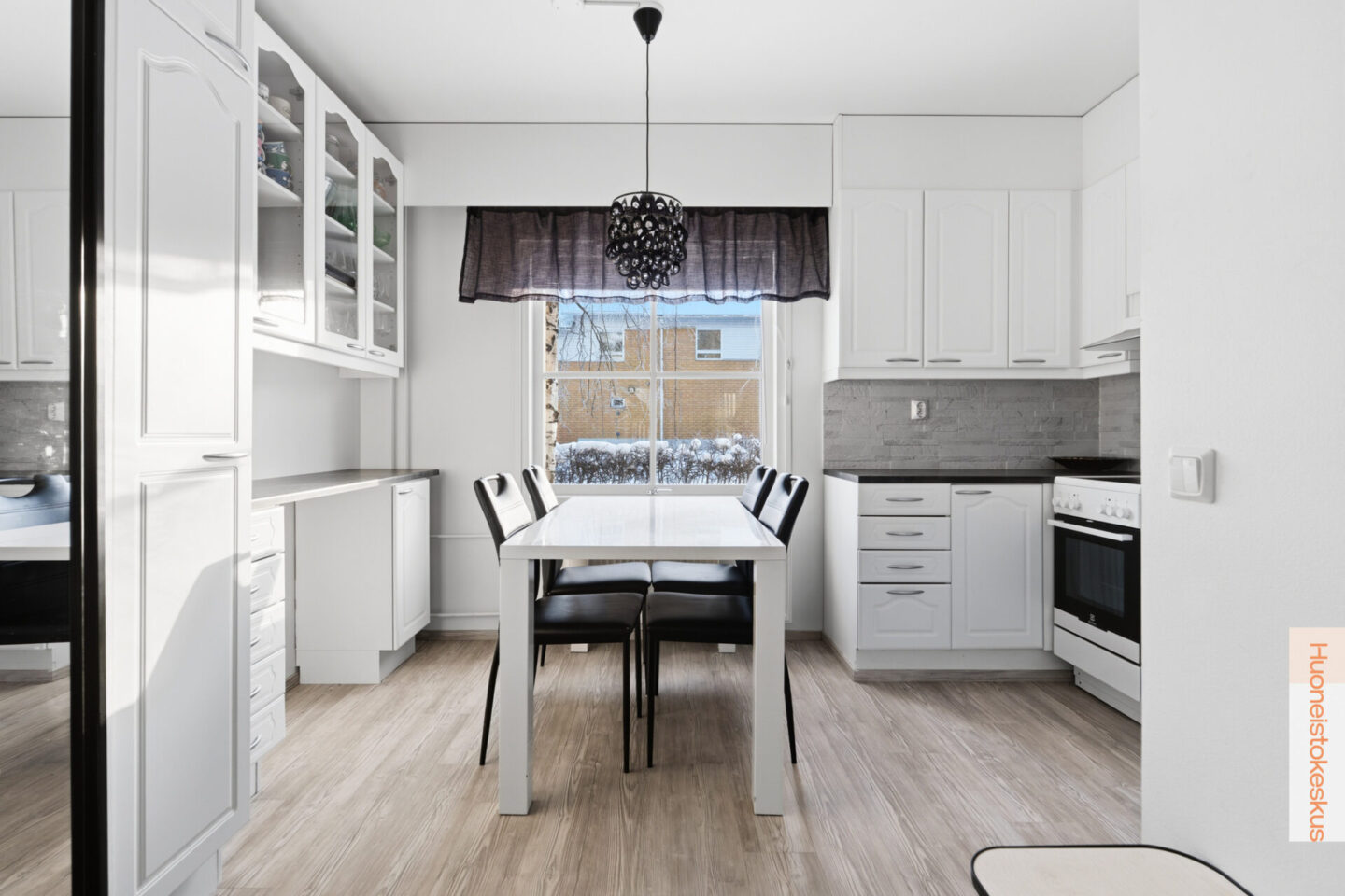 Liesi (Keraaminen liesi), työtasot (laminaatti), seinät (maali ja kaakeli), lattiat (vinyyli), liesituuletin (Hormiin, huippuimuri katolla), jääkaappipakastin, astianpesukone ja uuni/liesi, Kaapistot maalattu runkoineen, hyvässä kunnossa. Välitilassa LED-valaistus. |