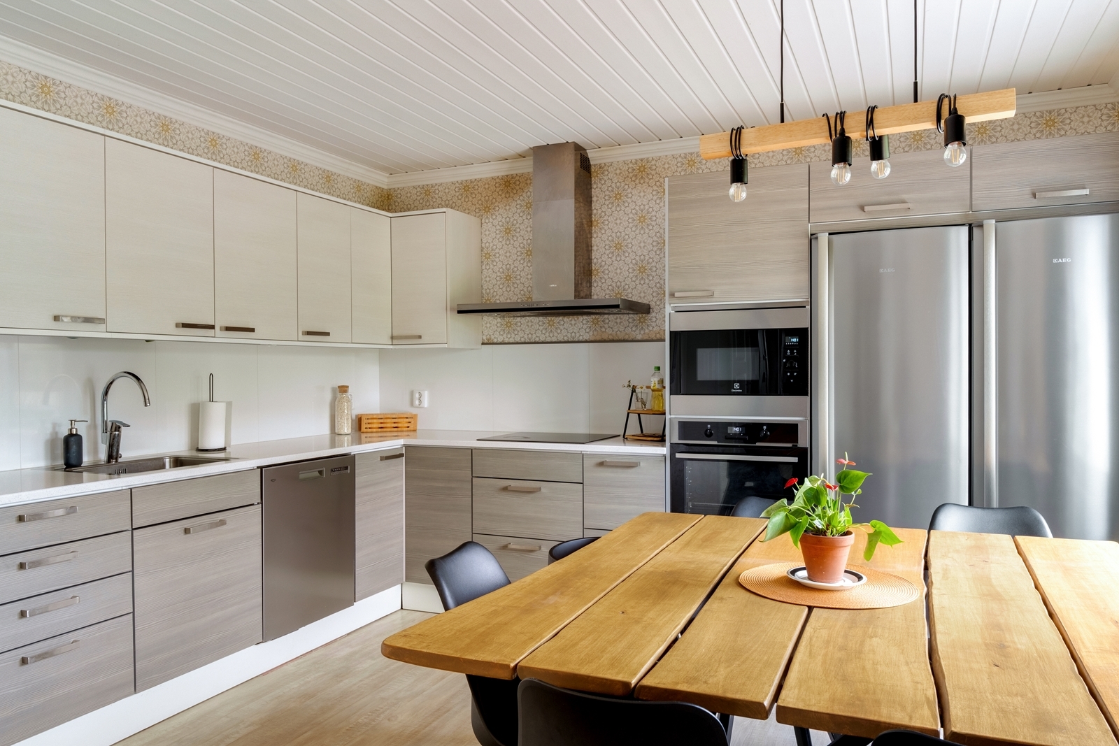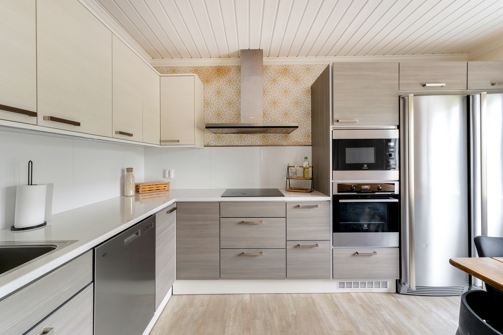 Liesi (Induktioliesi), seinät (tapetti ja maali), lattiat (vinyylikorkki), jääkaappipakastin, liesituuletin, liesi, mikroaaltouuni, astianpesukone ja kiinteät valaisimet |
