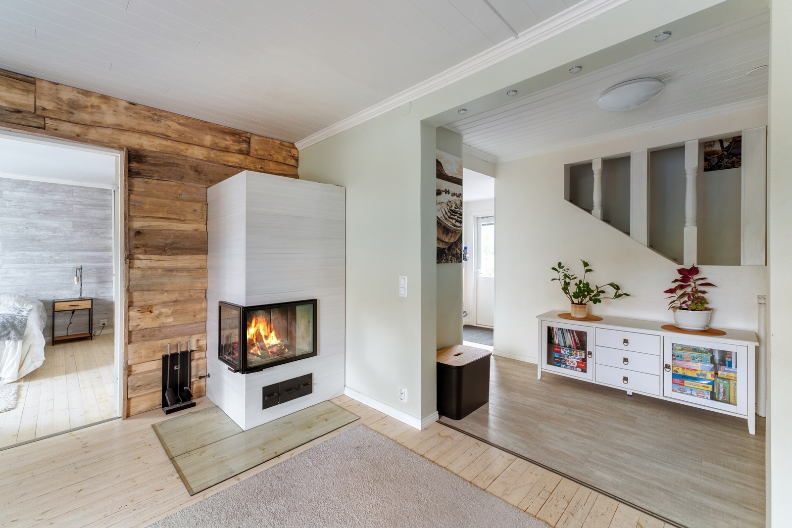 2019:Uusisepät varaava takka. Sälekaihtimet. Maalattu olohuoneen seinät, eteisaulan ja rappukäytävä. Vaihdettu yläkerran rappupinnat., vinyylilankku.
