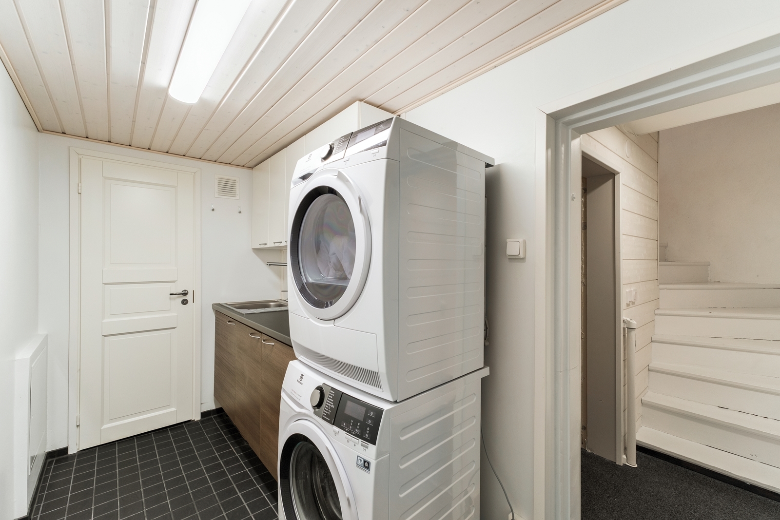 Lattiakaivo, pesukoneliitäntä, pesuallas ja pöytätaso, lattiat (laatta), seinät (maali) |