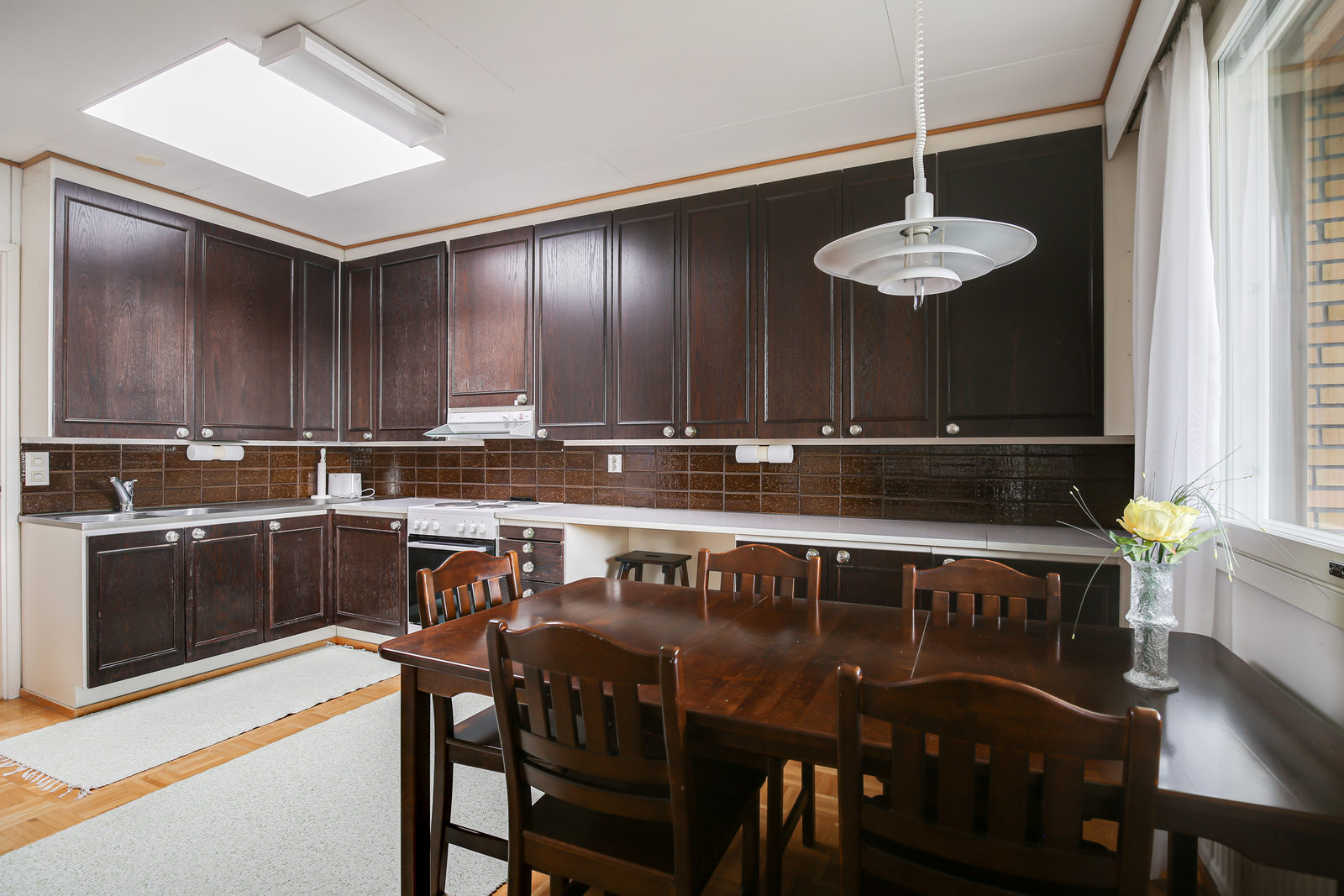 | Keittiön kuvaus | Liesi (sähköliesi), työtasot (laminaatti ja metalli), seinät (maali), lattiat (parketti), jääkaappi, liesi ja liesituuletin / hormi |