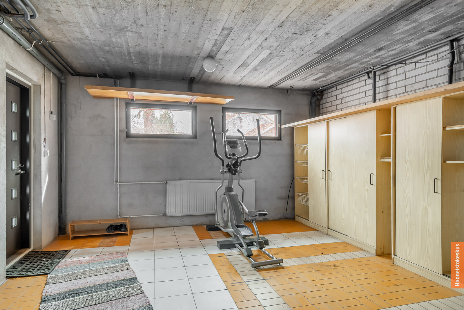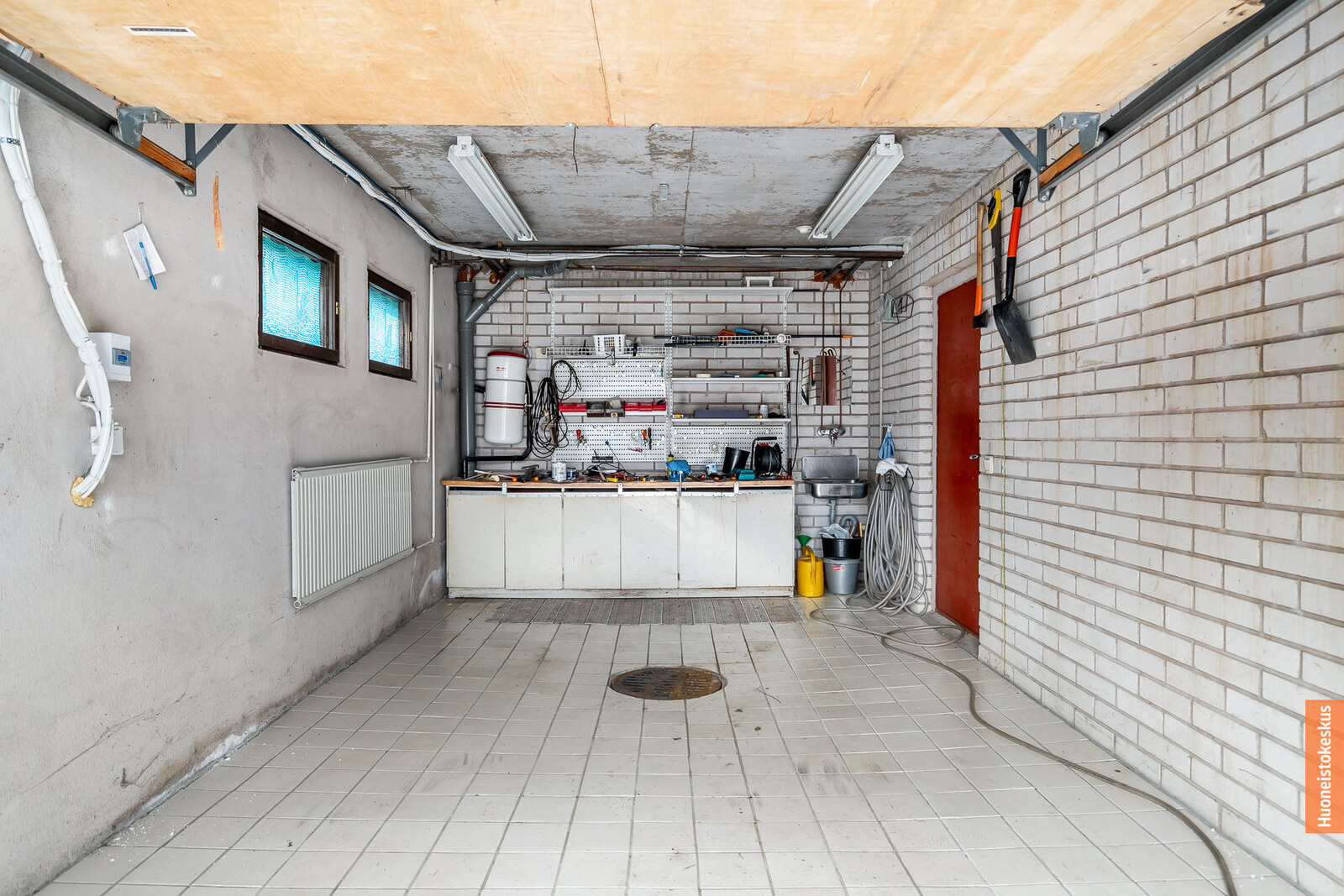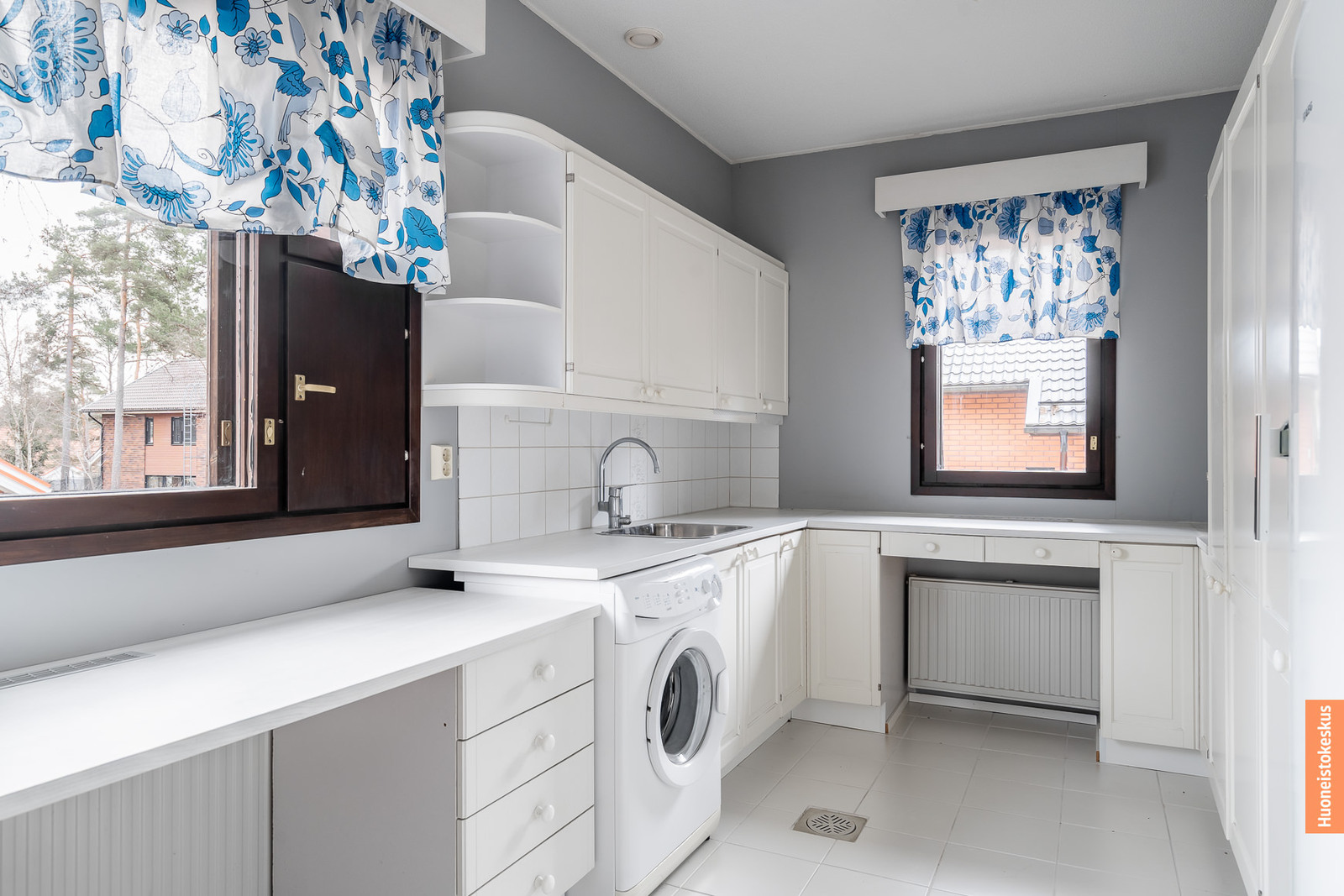 | Kodinhoitohuoneen kuvaus | Pesukoneliitäntä, keskuspölynimuri, lattiakaivo, pöytätaso, pesukone ja pyykkikaapit, lattiat (laatta), seinät (kaakeli ja maali) |