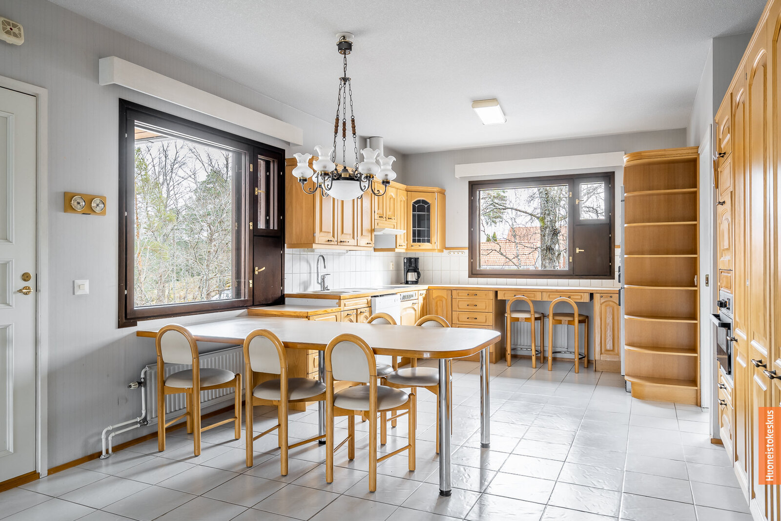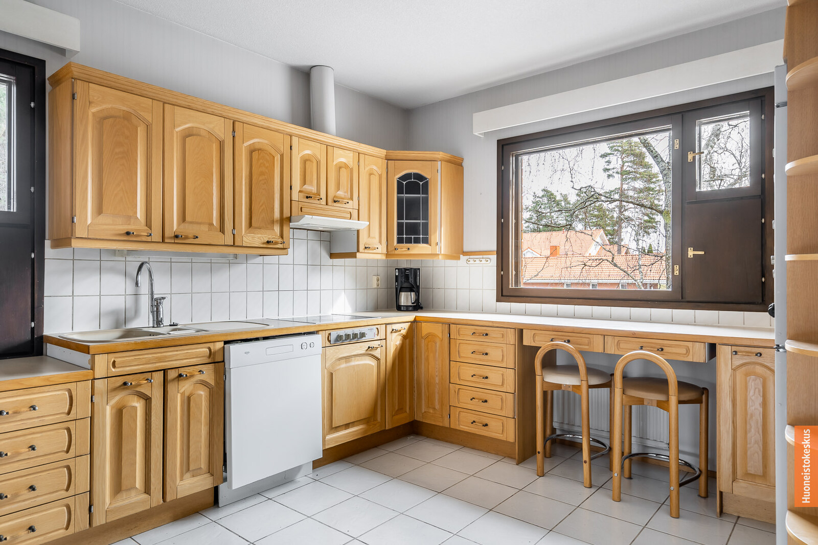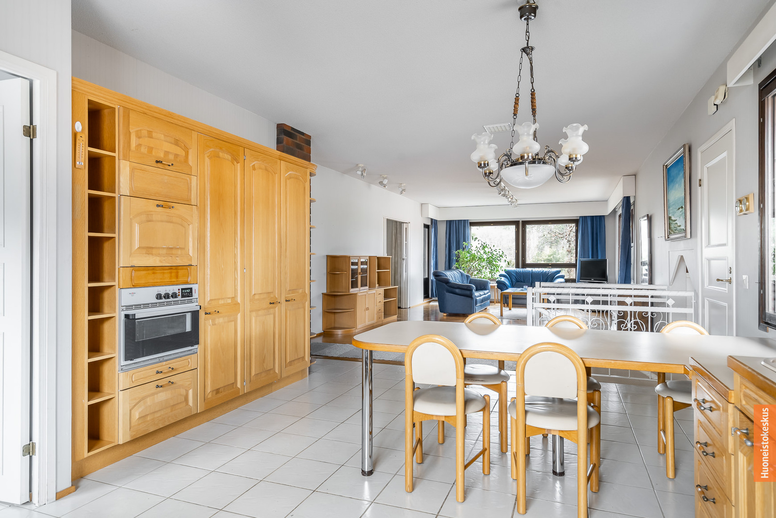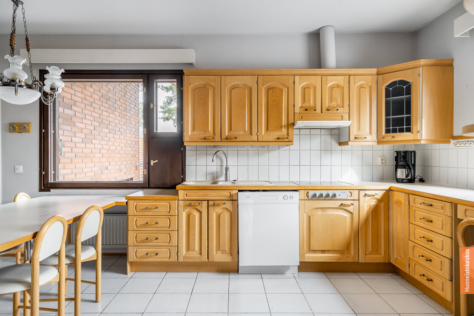| Keittiön kuvaus | Liesi (liesitaso, erillisuuni), työtasot (laminaatti), seinät (tapetti, maali ja osalaatoitus), lattiat (laatta), astianpesukone, jääkaappipakastin, liesituuletin, erillisuuni ja liesitaso |