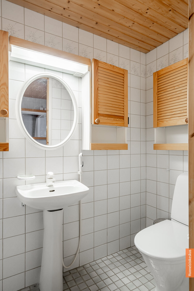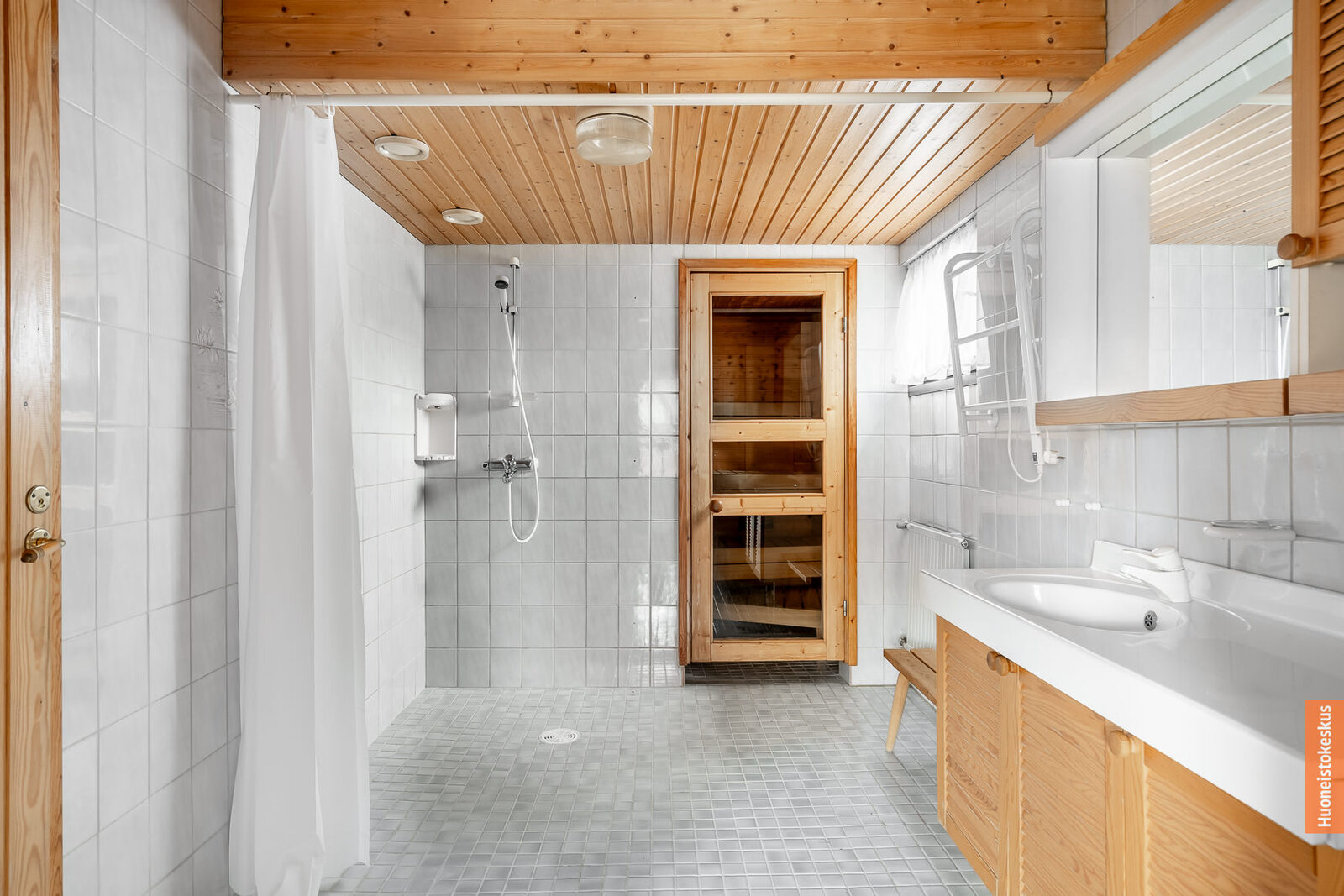 | Kylpyhuoneen kuvaus | Allaskaappi, lattialämmitys, wc-istuin, suihku ja asennettuja erikoisvarusteita, seinät (kaakeli), lattiat (laatta) |