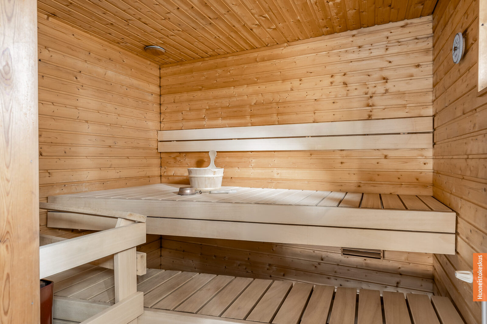 | Saunan kuvaus | Seinät (puu), lattiat (laatta), Sähkökiuas |