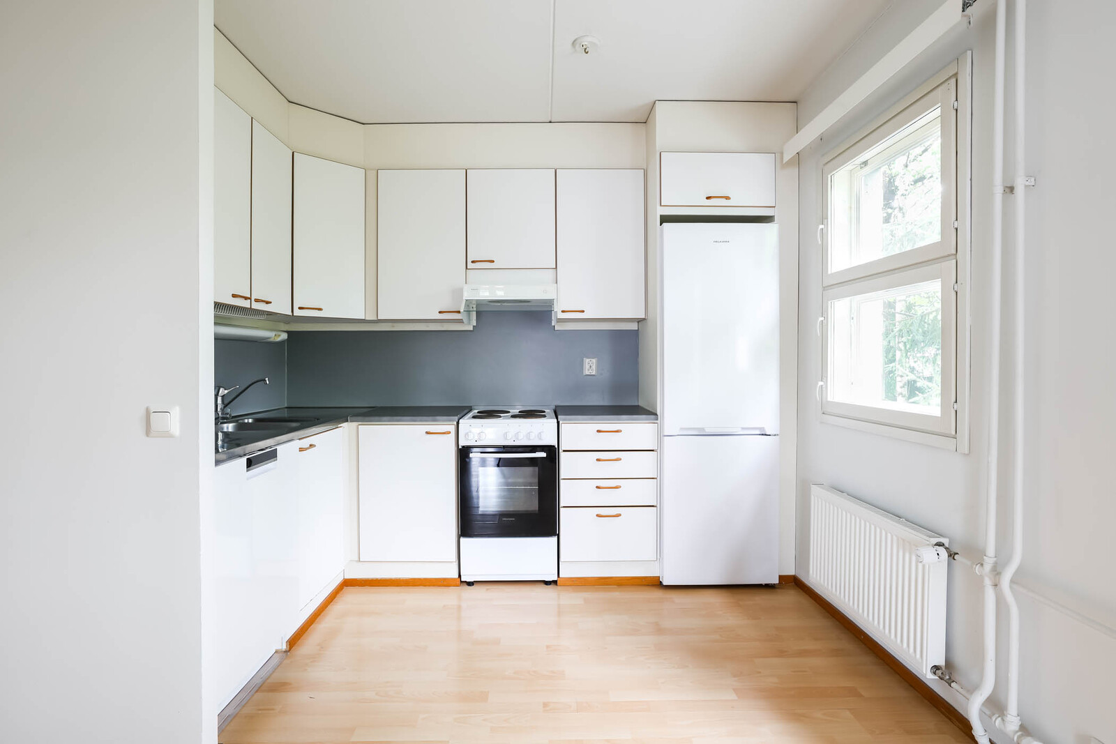 | Keittiön kuvaus | Liesi (sähköliesi), työtasot (laminaatti ja metalli), seinät (maali), lattiat (parketti), jääkaappipakastin, liesituuletin ja liesi |