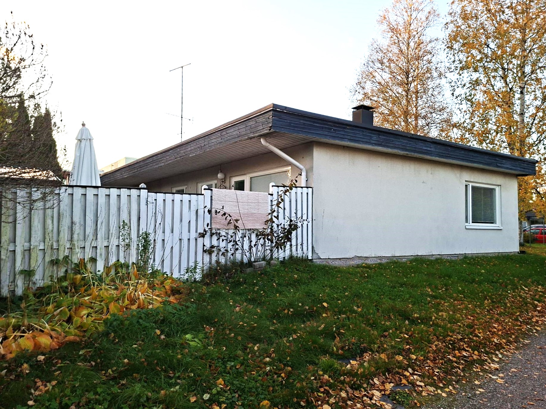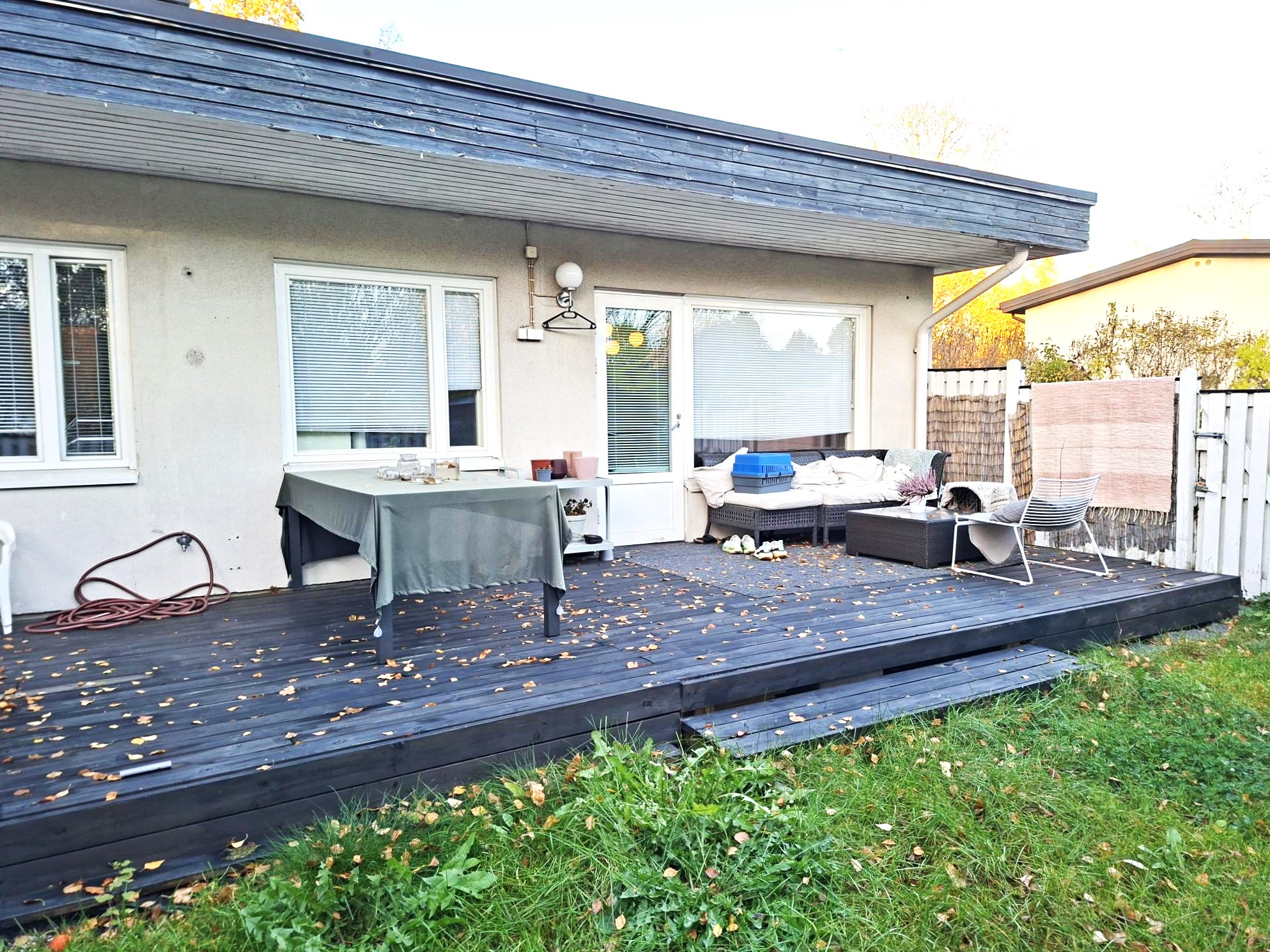 Huoneiston suojaisa ja tilava piha-alue antaa etelään. Pihalla on myös terassi, joka on osittain katettu. Piha on aidattu, joten omaa rauhaa riittää. Pihalla on pihavaja, joka antaa lisää säilytystilaa.
