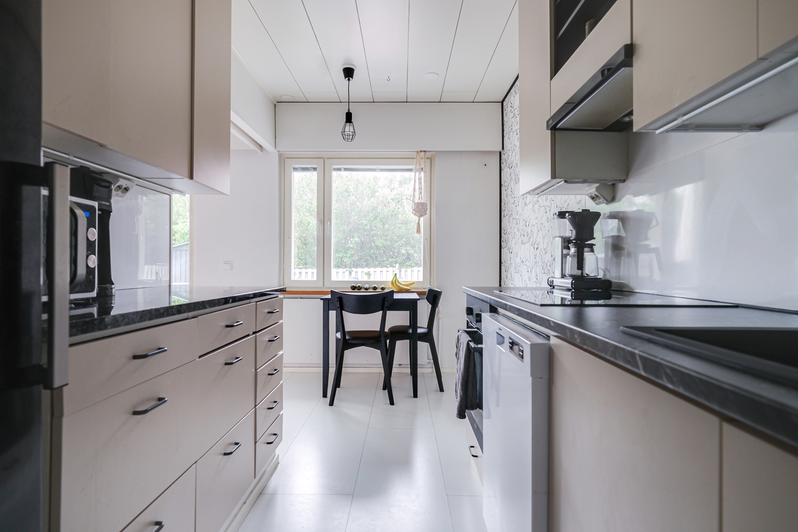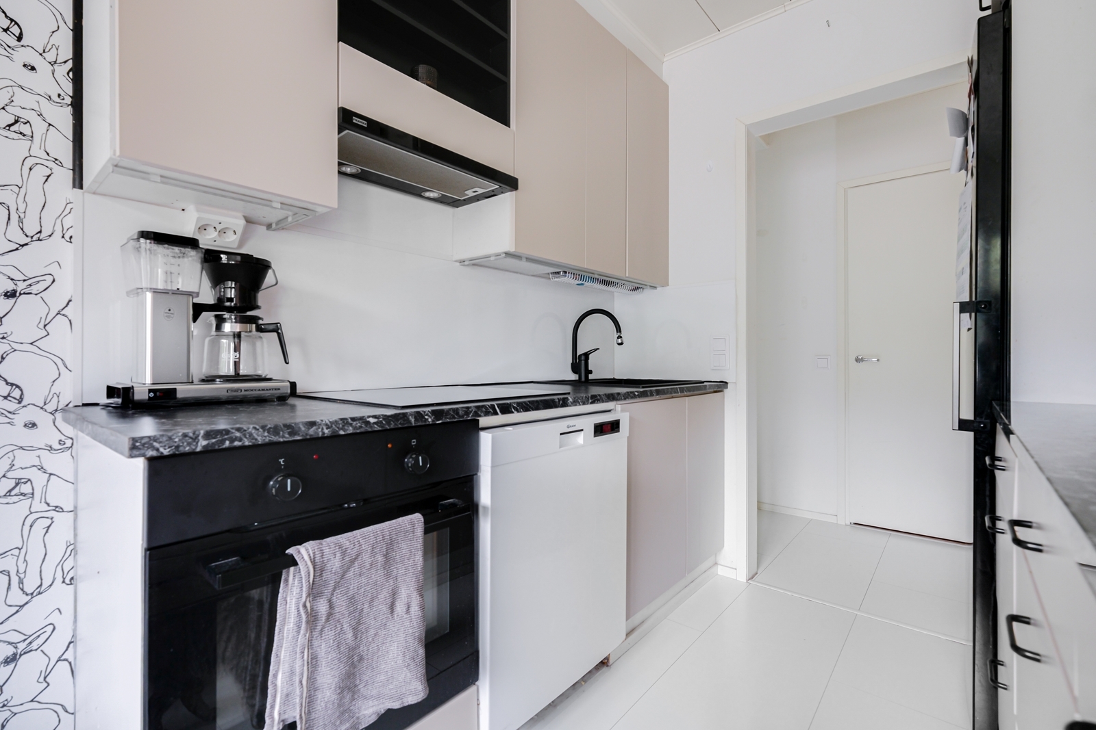 | Keittiön kuvaus | Liesi (Induktioliesi ja erillisuuni), seinät (tapetti ja maali), lattiat (laminaatti), liesi, astianpesukone, erillisuuni, jääkaappi, erillinen pakastin ja liesituuletin, vaalean ruskeat kaapistot, harmaat laminaattitasot, valkoinen välitila |