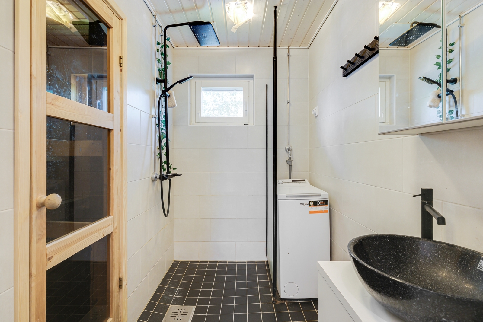 | Kylpyhuoneen kuvaus | Pesukoneliitäntä, lattialämmitys, suihkuseinä, peilikaappi, suihku ja kiinteät valaisimet, seinät (kaakeli), lattiat (laatta) |