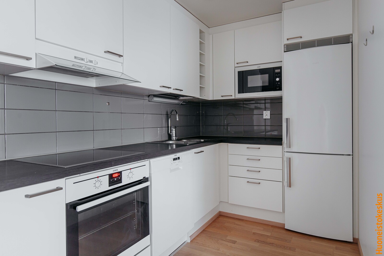 Liesi (Keraaminen liesi ja erillisuuni, liesitaso), työtasot (laminaatti), seinät (maali), lattiat (parketti), jääkaappipakastin, liesituuletin, astianpesukone, erillisuuni, mikroaaltouuni ja liesitaso |